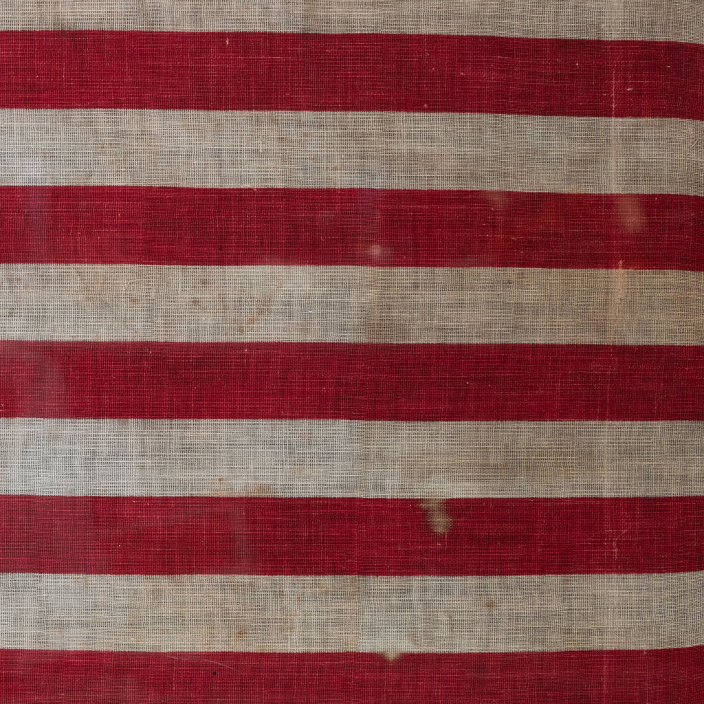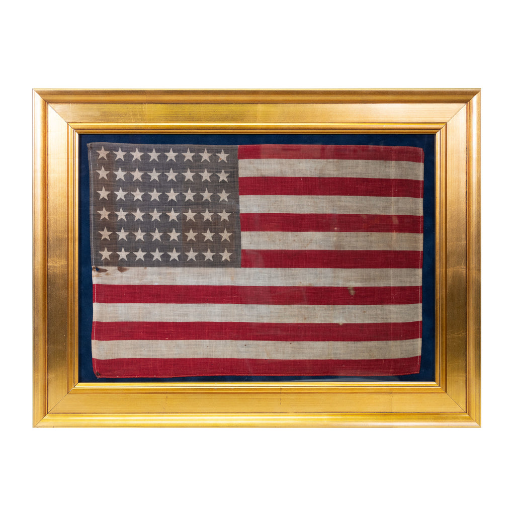 25th design patriotic flag with 48 stars. Arizona gained statehood on February 14, 1912. Printed on cotton. Notation on staff "Souvenir of St. Mary's Junior Dance January 29, 1938." This is the star count widely known to most Americans when they think of an "antique" flag. Because this is the flag that most grandparents and great grandparents would have seen from their youth, it is commonly found in estate sales and among the possessions of veterans of World War I, World War II and the Korean War. President Taft's executive order of June 24, 1912, which standardized the canton of the stars on the flag to 6 even rows of 8 stars makes unusual star configurations relatively uncommon and often indicative of an early flag. A card that was included "Eugene Oregon November 11, 1957. To Ronnie Prubasky from Vera K. Shultz. I carried this flag up and down Pennsylvania Avenue in Washington DC on the evening of November 11, 1918. Kara Kimball Shultz." Ex. Richard Pierce.