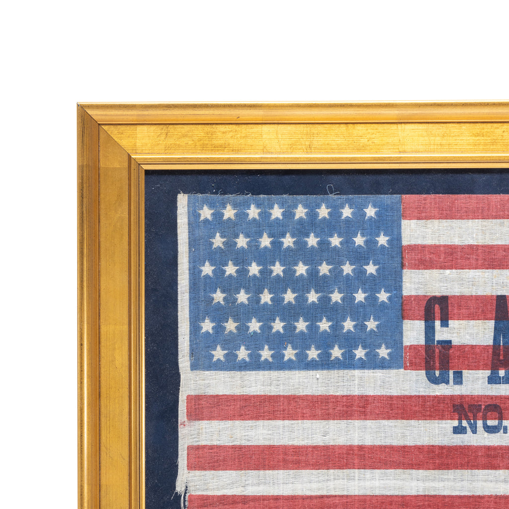 25th design with patriotic 48-Star Grand Army of the Republic (GAR) printed Civl War reunion flag. Arizona Statehood February 14, 1912. New Mexico Statehood January 6, 1912. Glazed muslin, the canton exhibiting an 8/8/8/8/8/8 staggered linear pattern, the stripes bearing over-printed "G. A. R., / No. 176" motto in black, horizontal orientation. Framed. Circa 1908. 10 3/4" x 17 3/4". Frame 17" x 24".