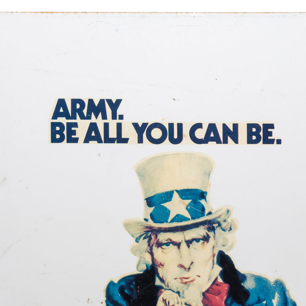 Vintage United States Army recruitment metal sign that reads "Army Be All That You Can Be. I Want You for the U.S. Army. Nearest Recruiting Station." Double sided. 46"H x 29 1/2"W