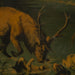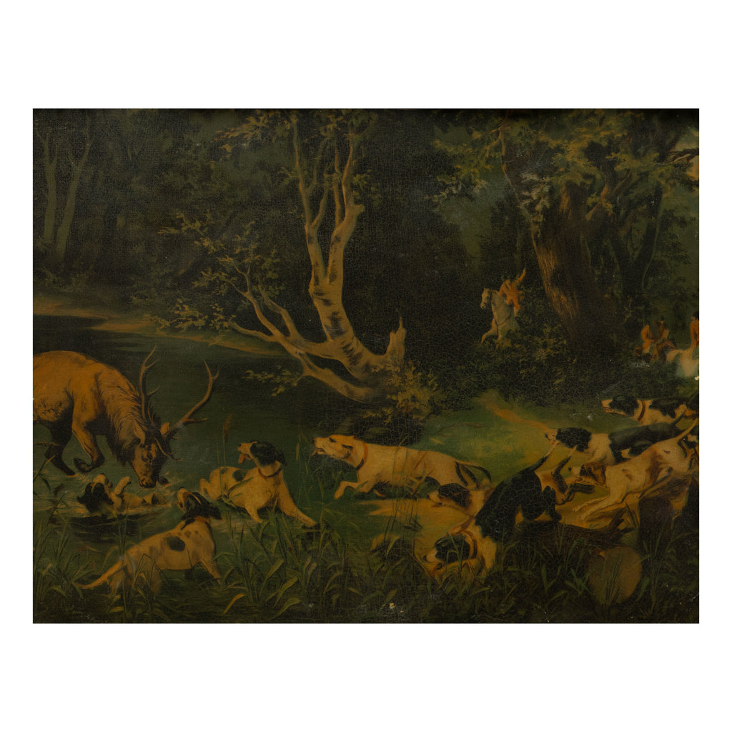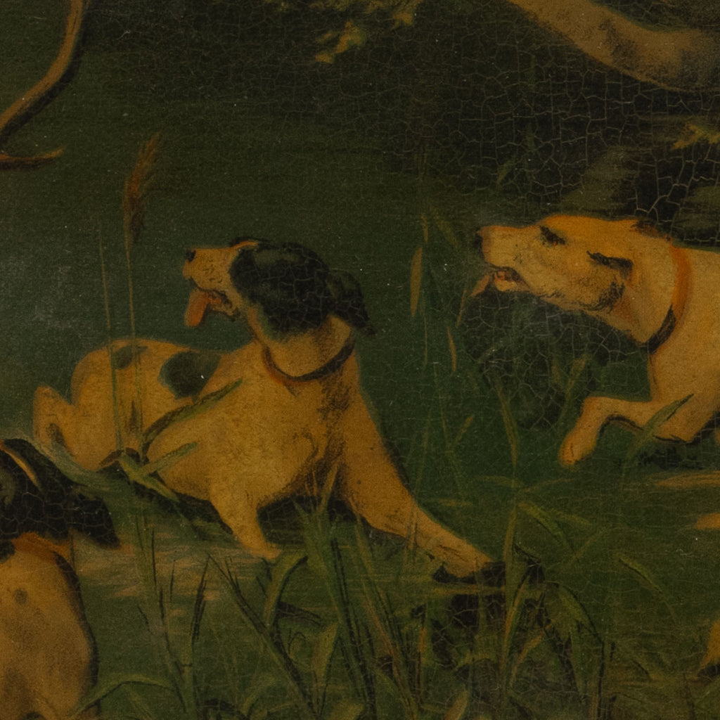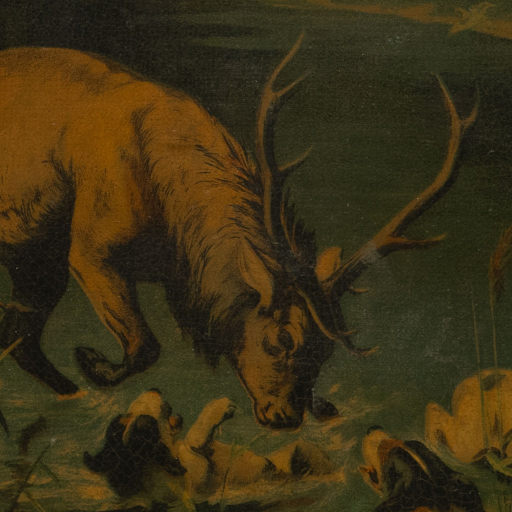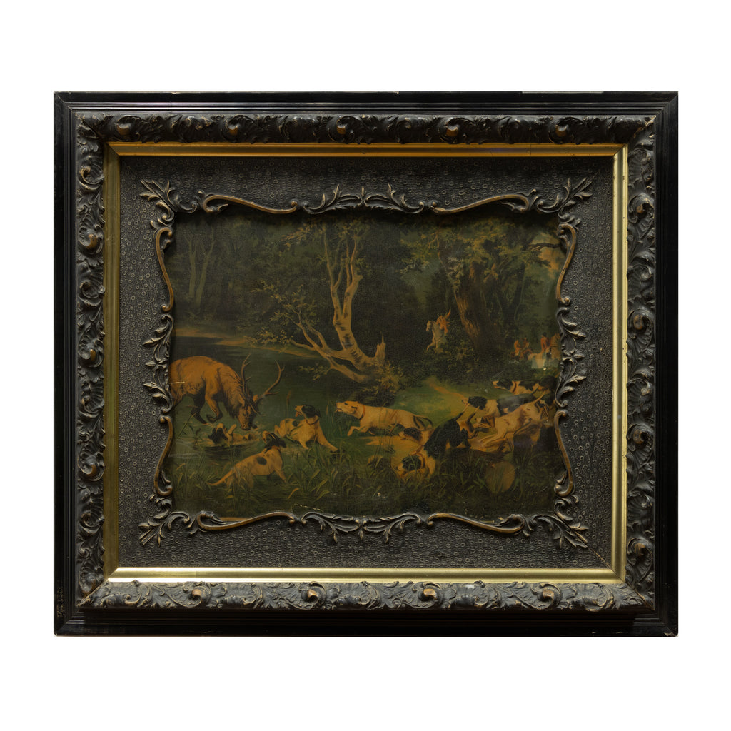 Chromo lithograph; 19" x 15". 19th Century Bavarian hunting scene - horses, hounds and stag. Decorative period frame.