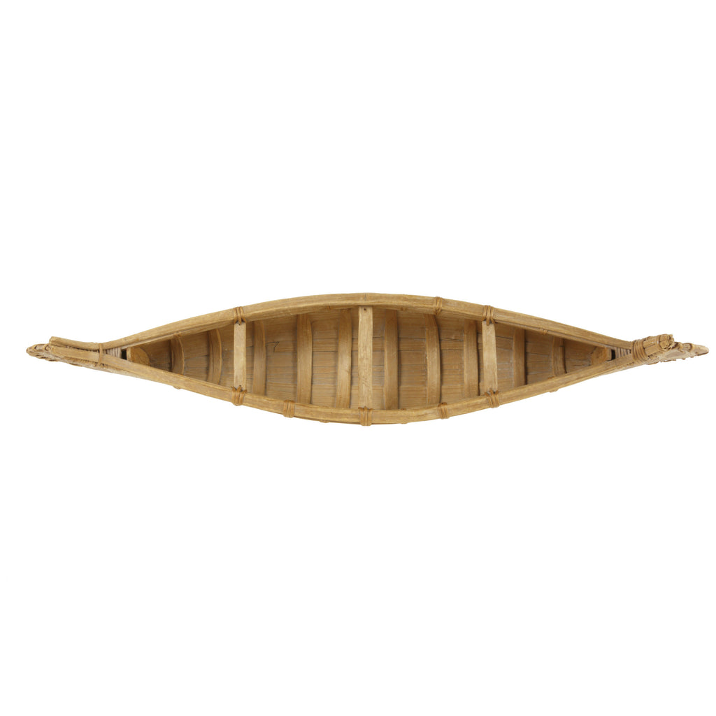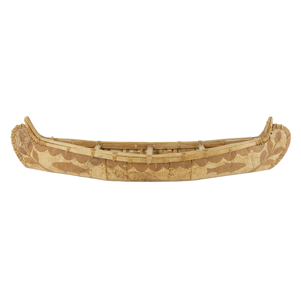 Traditional birch bark model canoe. With etched leaves and fish designs. 24”L, top center width 5”.