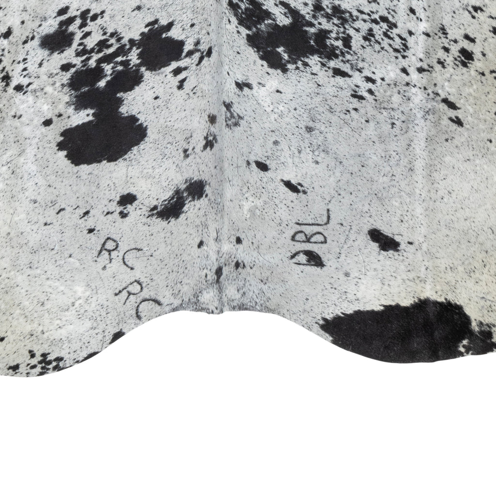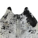 Black and white speckled longhorn hide. White fur with small black speckles and some black spotting.