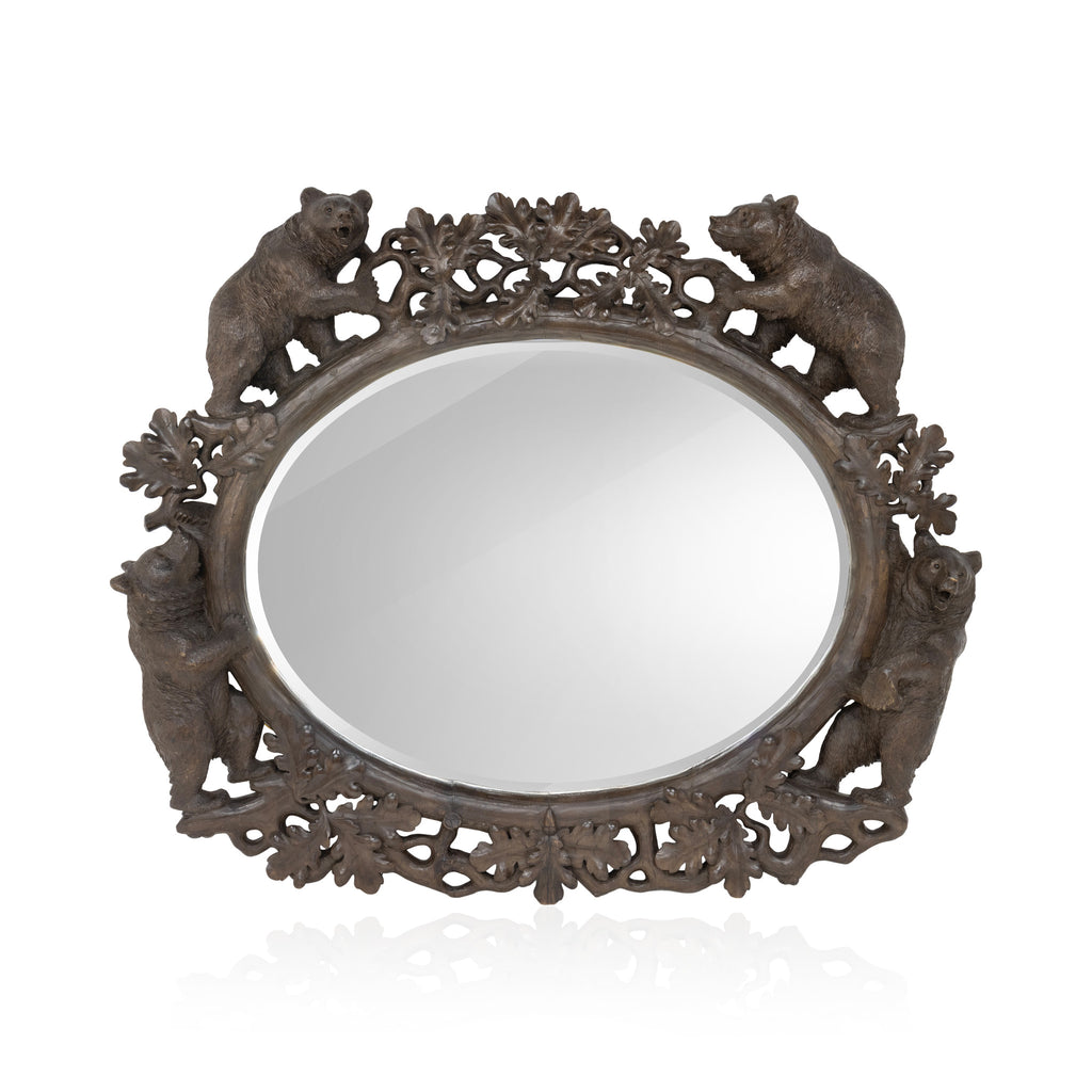 Black Forest carved bear hall mirror. An exquisite and highly-detailed mirror with four bears and oak leaf motif around the perimeter. Bears comes with glass eyes. Magnificent workmanship. Excellent condition. Estimate 1920s. 38" x 48"