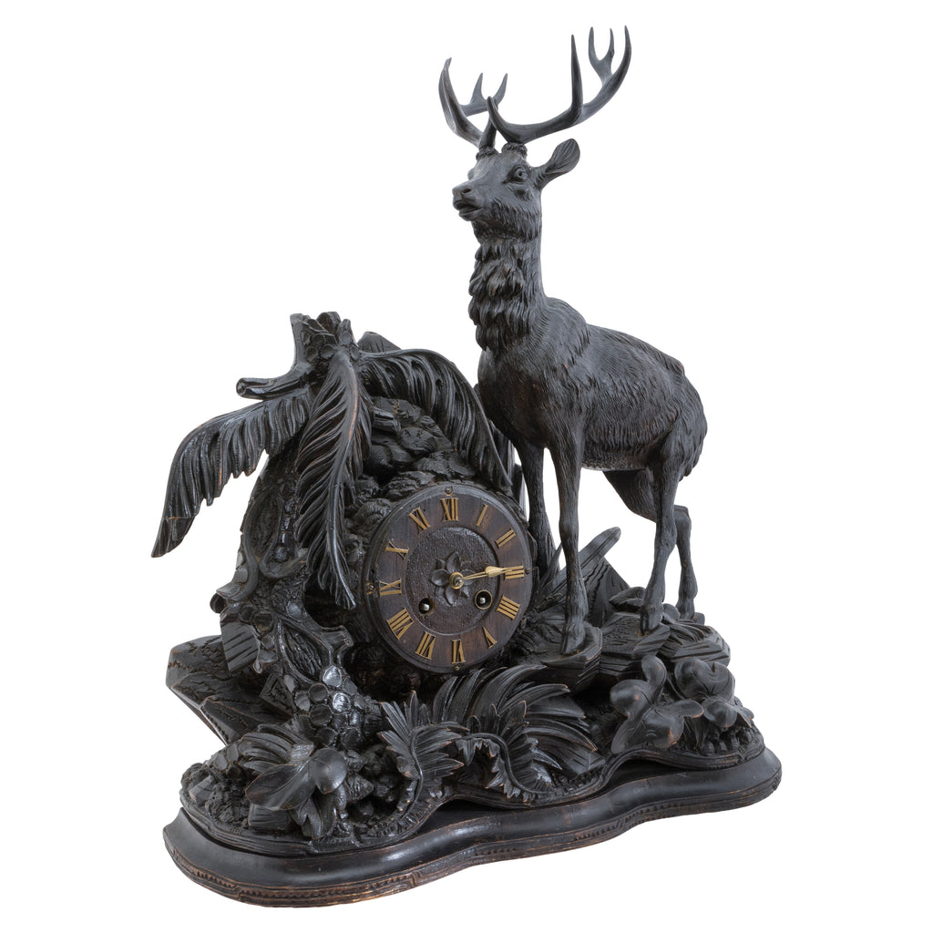 Black Forest carved mantle clock with red stag finial. The clock movement is marked "Medaille Dargent Vincenti, 1855". A large red stag with foliate base. In working condition. Circa 1890. 16" x 6" x 20"H This is a large or fragile item, so shipping will not calculate on our website. Please contact the Gallery at (208)769-7575; info@ciscosgallery.com to get a shipping quote, or to purchase.