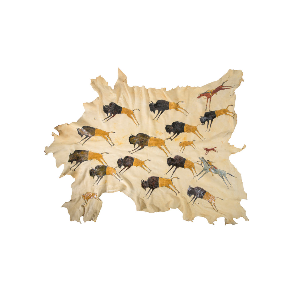 Blackfeet hide painting on brain/smoke tanned buck hide depicting a Native buffalo hunt by David Dragonfly. David resides in Browning, Montana. He attended the Institute of American Indian Art in Santa Fe. His styles and images appeal to the viewer and ar
