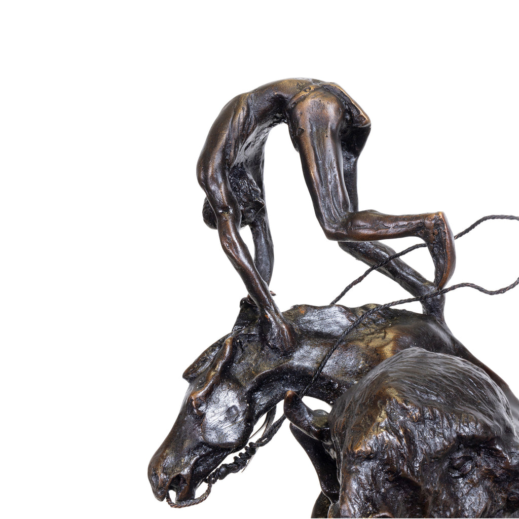 A native of Canton, New York, Remington left college at the age of 19, looking for adventure in the West. Remington operated his own ranch in Kansas, and in 1886 he gave it up as a failure and came back to the East. The experience served him well in his later career as an artist. “What success I have had,” Remington once told a newspaper reporter, “has been because I have a horseman’s knowledge of a horse. No one can draw equestrian subjects unless he is an equestrian himself.” As an artist, Remington first made a name for himself as an illustrator and painter, and began sculpting only 14 years before his death in 1909. “I was impelled to try my hand at sculpture by a mental desire to say something in the round as well as in flat. Sculpture is the most perfect expression of action. You can say it all in clay.” The first Remington in clay was “Bronco Buster,” completed in 1885. Among his admirers were Theodore Roosevelt, who once said that “Remington portrayed a most characteristic and yet vanishing type of American life. The soldier, the cowboy, the rancher, the Indian, the horses and the cattle of the plains will live in his pictures and bronzes, I verily believe for all time.”