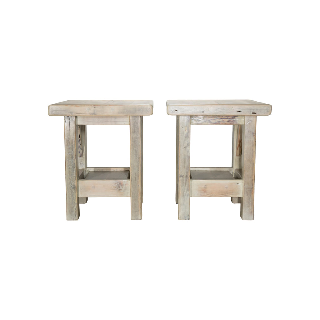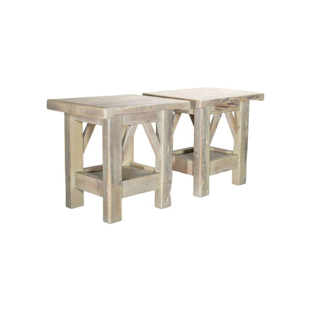 Camas Prairie coffee table with matched pair of side tables. Repurposed fur with white wash. Coffee table 59" x 36" x 20", side/lamp tables 26" x 22" x 26" Sold as a set
