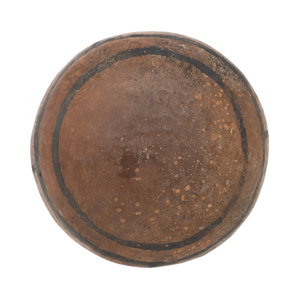 Casas Grandes Madera black on red type pottery olla. Ca. 1250 - 1450 CE. Hand built stone burnished pottery jar of circular form with a round but stable base, a bulging midsection, and a pierced suspension loop on either side of the flared rim. The russet hued exterior is decorated with hand painted black spirals that coil broadly around the mirrored tendrils. Professional repair and restoration to base, with resurfacing and overpainting along new material and break lines. Nice condition. Great motifs across exterior. Casas Grandes (Spanish for Great Houses; also known as Paquime) is a prehistoric archaeological site in the northern Mexican state of Chihuahua. Casas Grandes is one of the largest and most complex Mogollon culture sites in the region. Settlement began after 1130 CE and would see the larger buildings developed into multi-storied dwellings after 1350 CE. The community was abandoned approximately 1450 CE. Casas Grandes is regarded as one of the most significant Mogollon archaeological zones in the northwestern Mexico region, linking it to other sites in Arizona and New Mexico in the United States, and exhibiting the expanse of the Mogollon sphere of influence. 5.57"D x 3.8"H. Ex. Anderson Collection.