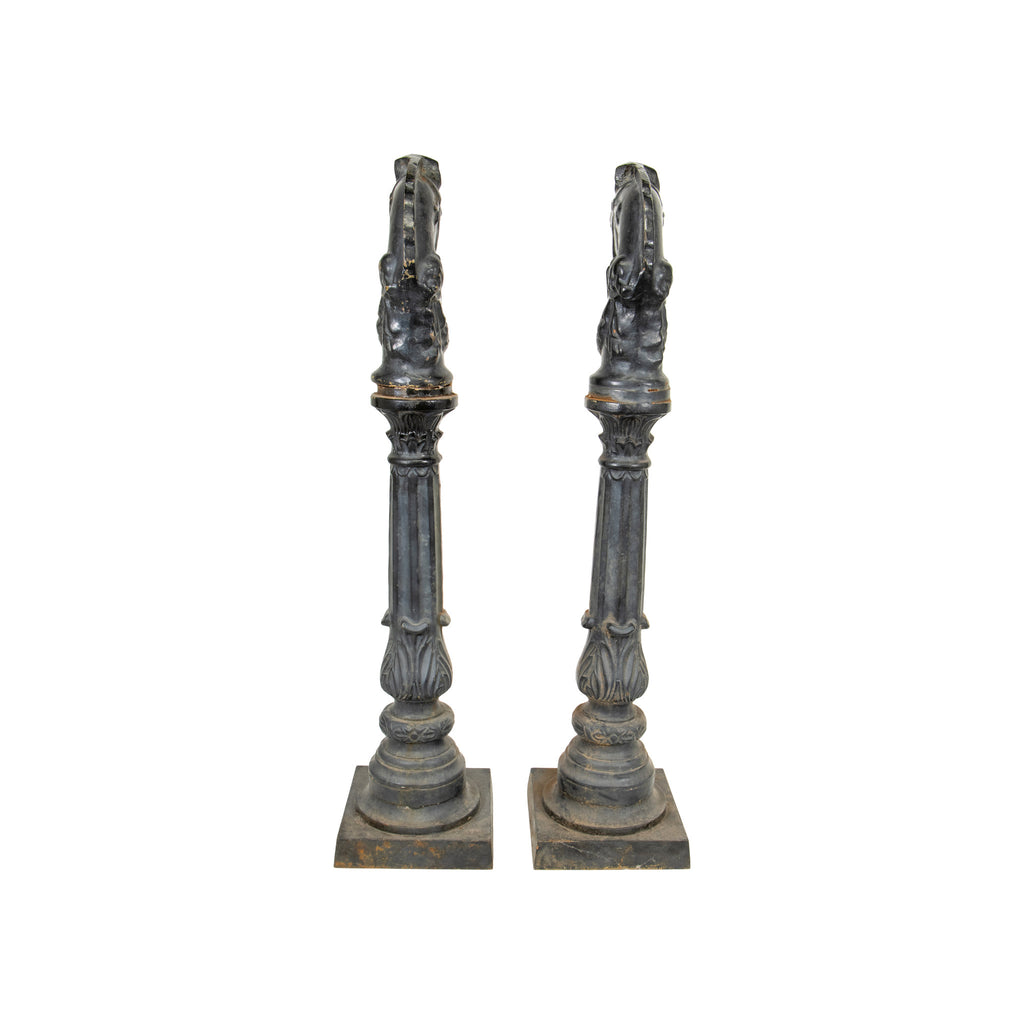 Cast iron horsehead hitching posts in the Victorian style. Mounted with horseheads grasping square rings in their mouths, on fluted, tapered coumn form standards with leaf molded capitals and bases, on square plinths.
