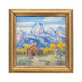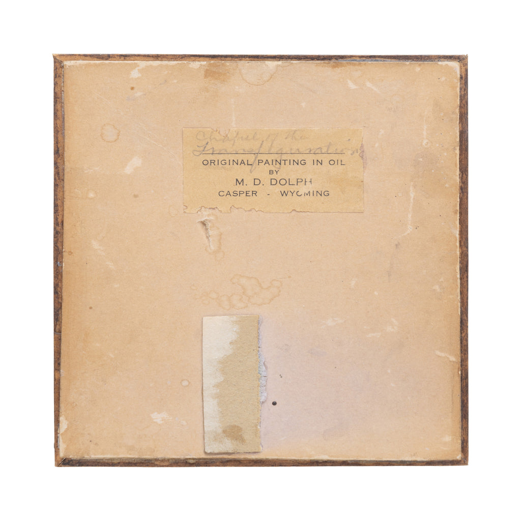 Chapel of the Transfiguration (which provides a view of the Grand Teton mountain range) by Dorothy Dolph. 4 1/4" x 4 1/4". Original frame. Title penciled on back. Dorothy and her husband homesteaded in Wyoming in 1913. In 1925, she painted an historical painting of Casper as it appeared in 1912, which was purchased by the governor of Wyoming. As the Great Depression began, Dorothy started painting anything that would sell: mountain landscapes, cabins, ranch buildings, horses, cattle, sheep and sheep wagons. She was able to earn cash for her paintings, but she also frequently traded for tires, gas, and groceries. Her first big commission came when Mr. F. J. Haynes approached her and commissioned paintings for his store in Yellowstone Park. During the next two years, Dorothy painted 1,465 paintings for him to be sold at the Park’s concession stores. In the early 1930s, she took to the road in search of fresh subject matter, traveling and camping around the country and covering most of the lower 48 states, Alaska, and much of Canada. Dorothy spent her final years in Post Falls, Idaho, where she could be closer to her sons, but continued to enjoy an active lifestyle until her death in 1979 at the age of 94.