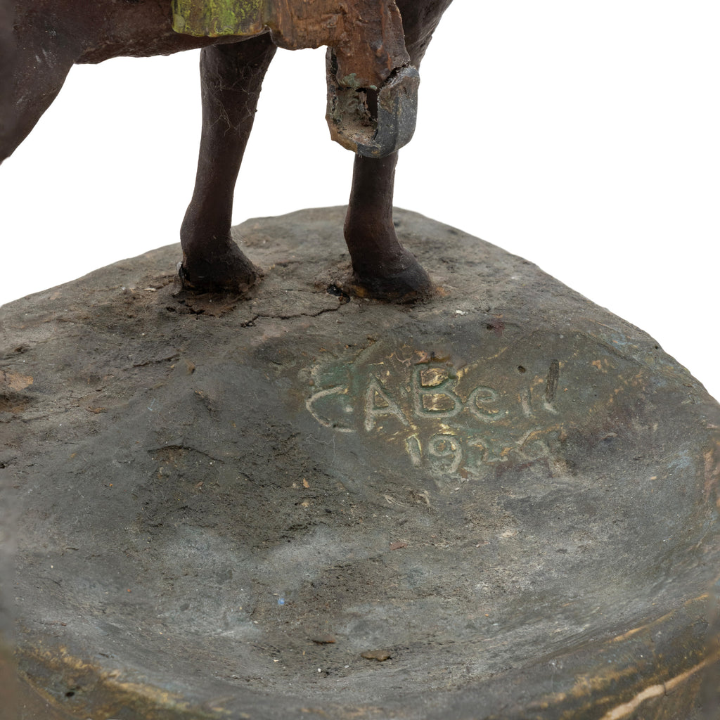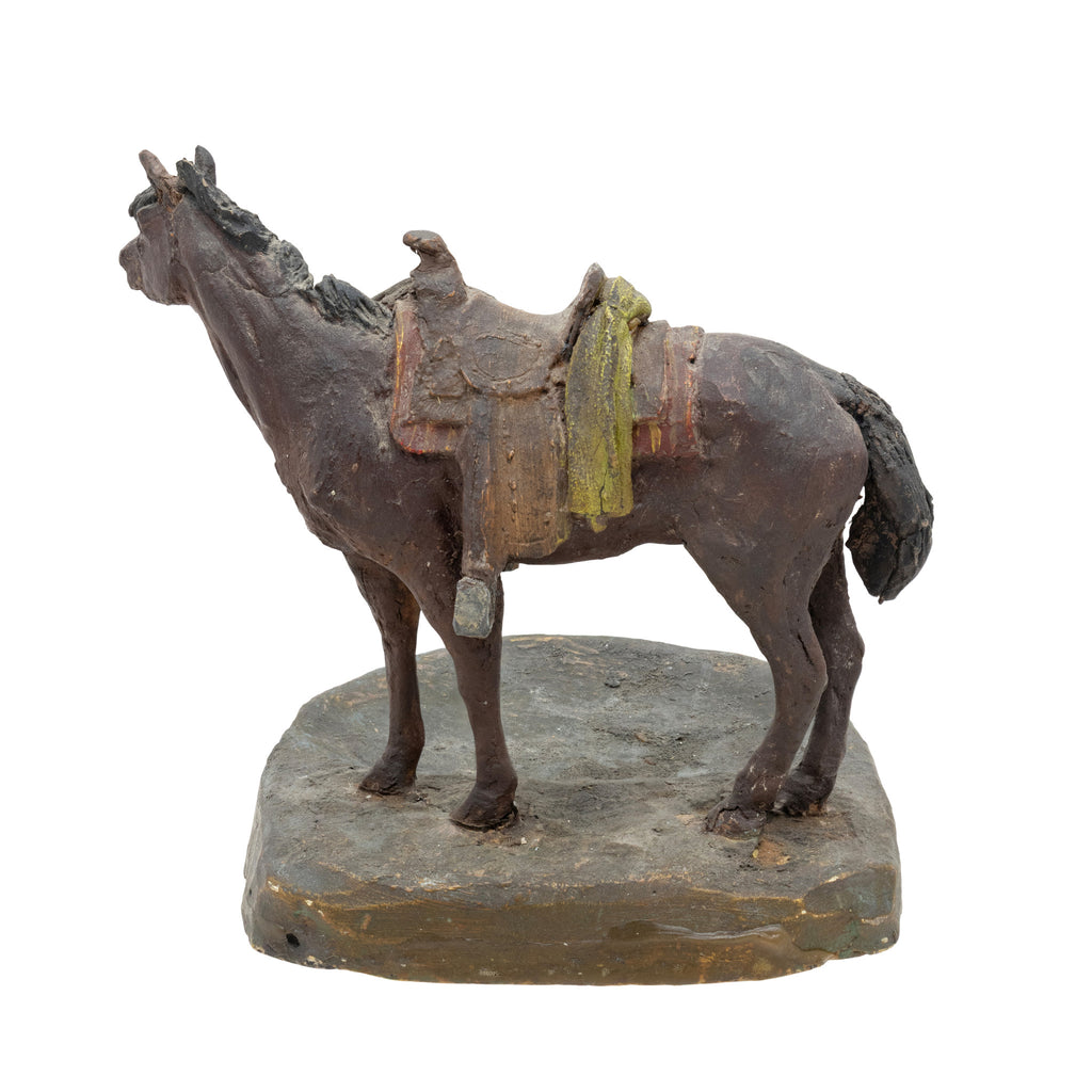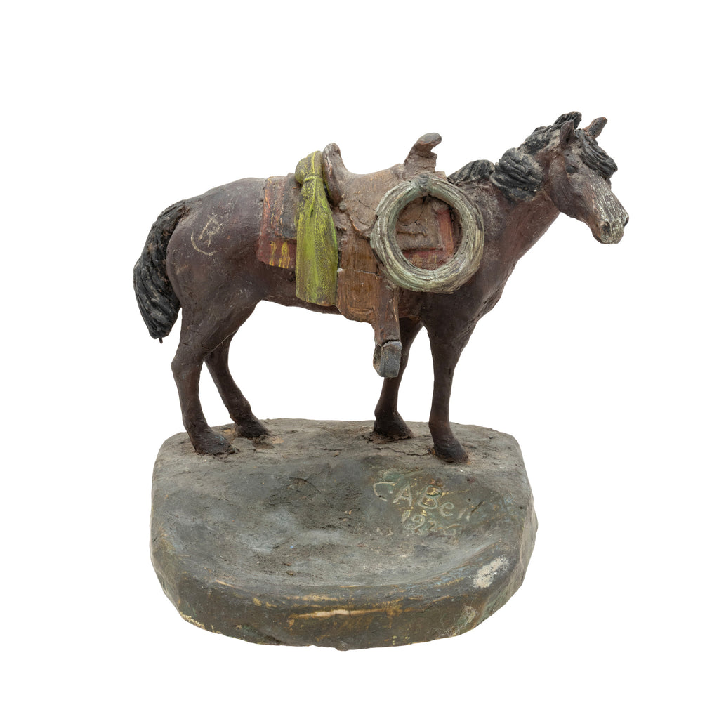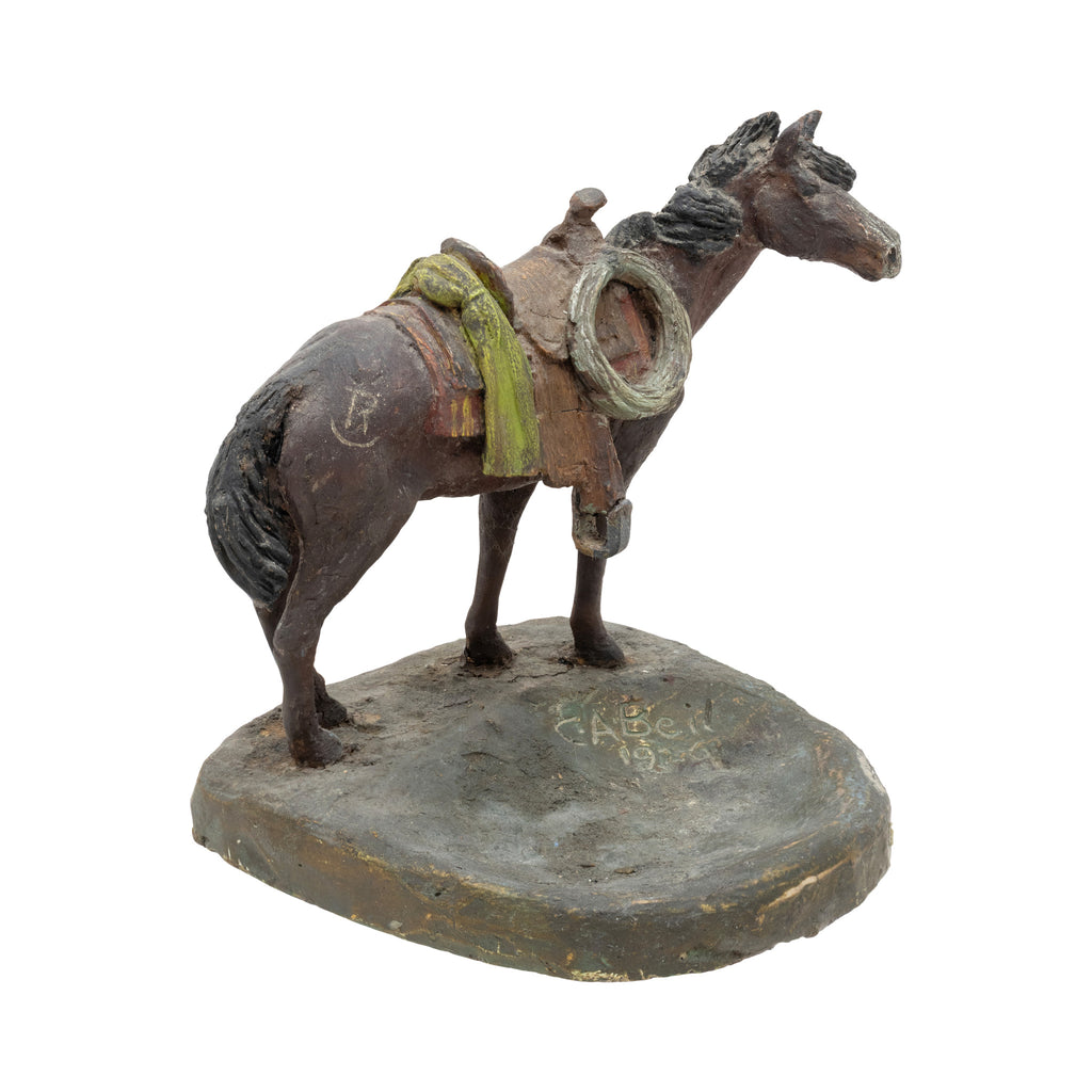 Original plaster sculpture dresser tray dated 1928. Horse with Rocking R brand. Noted for his western sculpture, Beil became a friend of Charles Russell when Beil was a working Montana cowboy who wanted to sculpt. Beil established a studio in Great Falls where Russell visited, and later established his studio. Two days before Russell died, Russell took the local newspaperman to Charlie Beil's little studio to get publicity for Beil, call Beil the "Best feller I ever seen modeling hosses an cowpunchers." At Russell's funeral in 1926, Beil led the procession with Russell's empty saddle horse. In the 1930s, Beil moved to Alberta where he designed the first trade dollars, which were legal tender, for the cavalry Stampede in 1963. This piece was given to James Graham by Charlie Beil. Graham was a mining equipment owner in Butte, MT in 1926. Graham also designed the golf course, which is now the "Silver Bow Country Club" in Butte. This is the original. 5" x 4" x 5"H