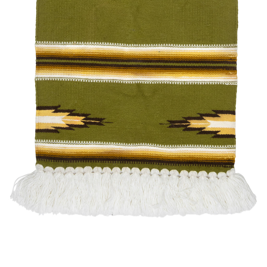 Chimayo double saddle blanket with fringe. Slightly used. We had cleaned. Heavy saddle blanket weight. Not a common piece. 56" x 28" plus 7" fringe