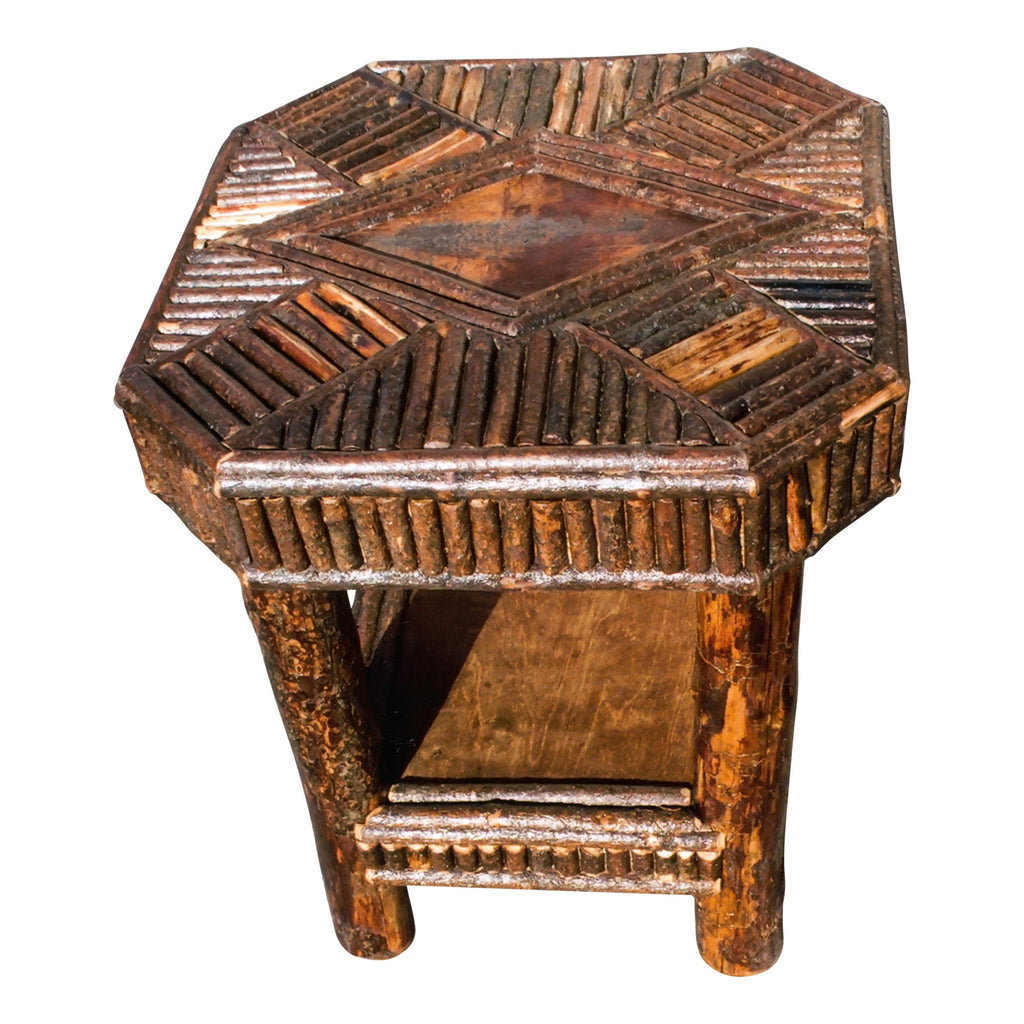 Matched pair - lodge pole twig-work. Occasional/lamp tables. Magazine storage below. Price for pair. In stock.