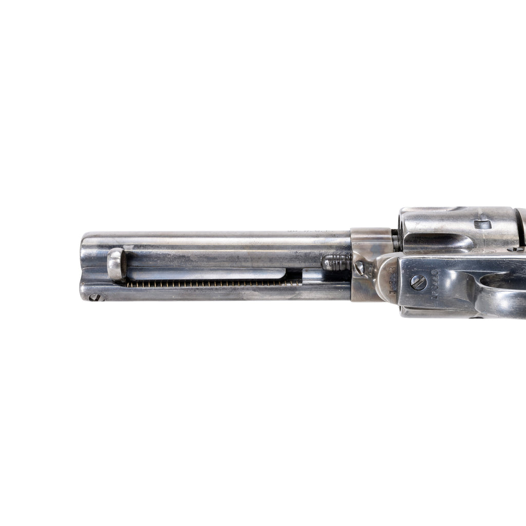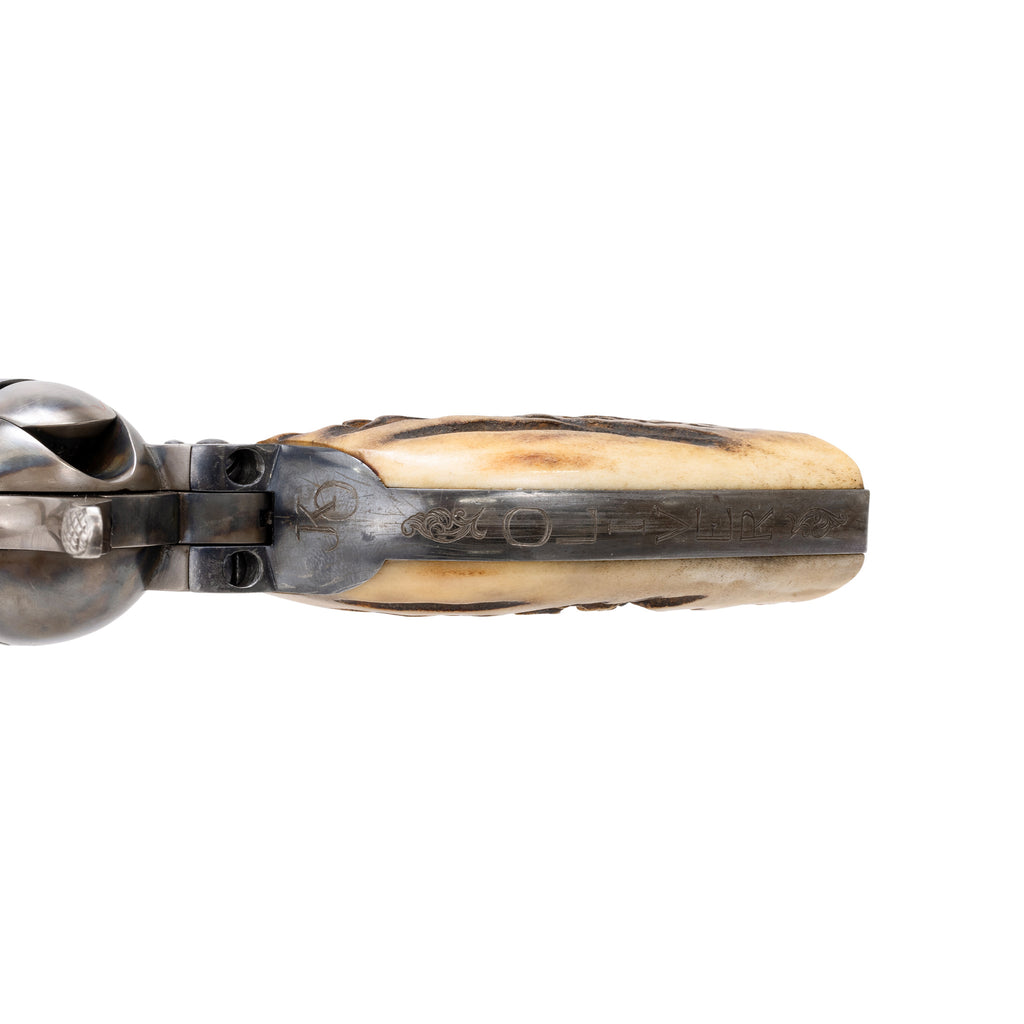 Sherman, Texas Shipped Antique Colt Black Powder Single Action Army Revolver with Inscription and Factory Letter. 38 WCF, 4 3/4" round barrel, blue/case hardened finish, stag grips. Serial #163448. Factory letter states revolver was shipped to Roberts, Hardwicke & Taylor Co. of Sherman, Texas, on December 10, 1895 with a 4 3/4 inch barrel in .38-40 caliber, blue finish, and type of stocks not listed. This was a six gun shipment. The back strap shoulder is engraved with the initials "JKO", and the back strap is engraved "OLIVER." Very good condition as refinished with smooth gray patina on the balance, slightly undersized grips. Mechanically fine. Cisco’s has additional firearms in the Gallery post 1896. Call for itemized catalog.