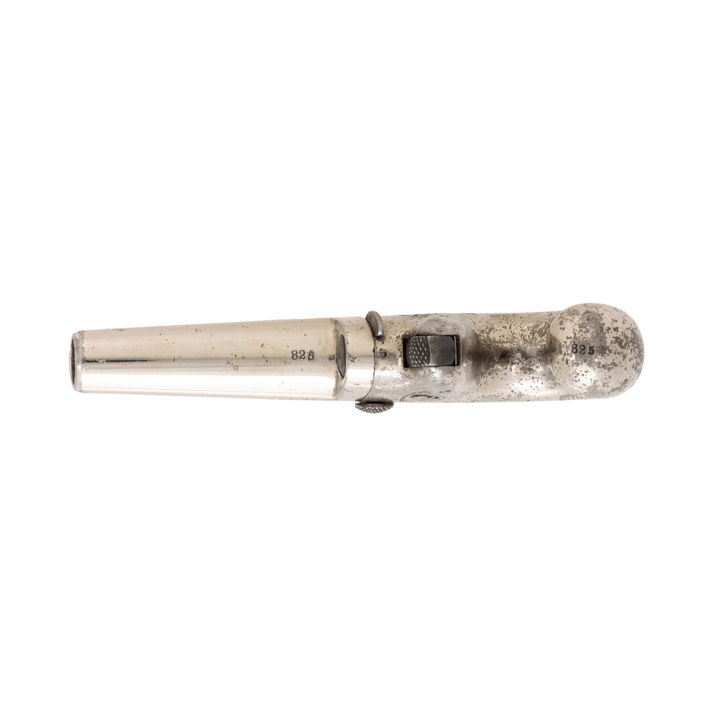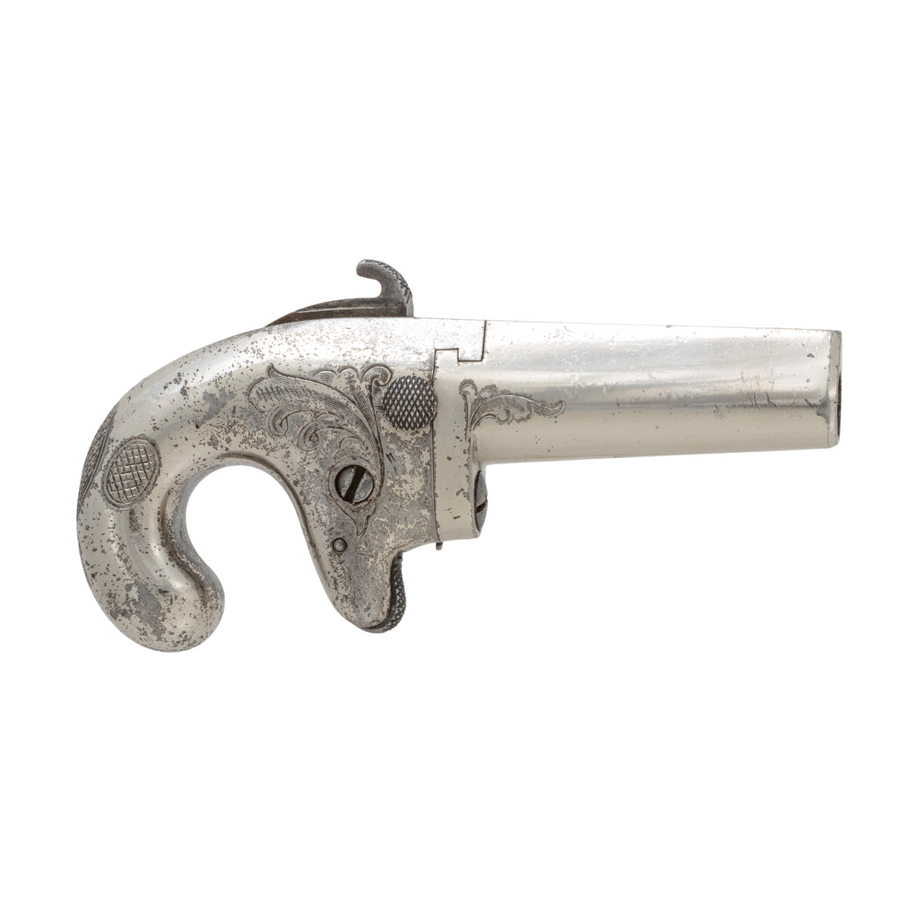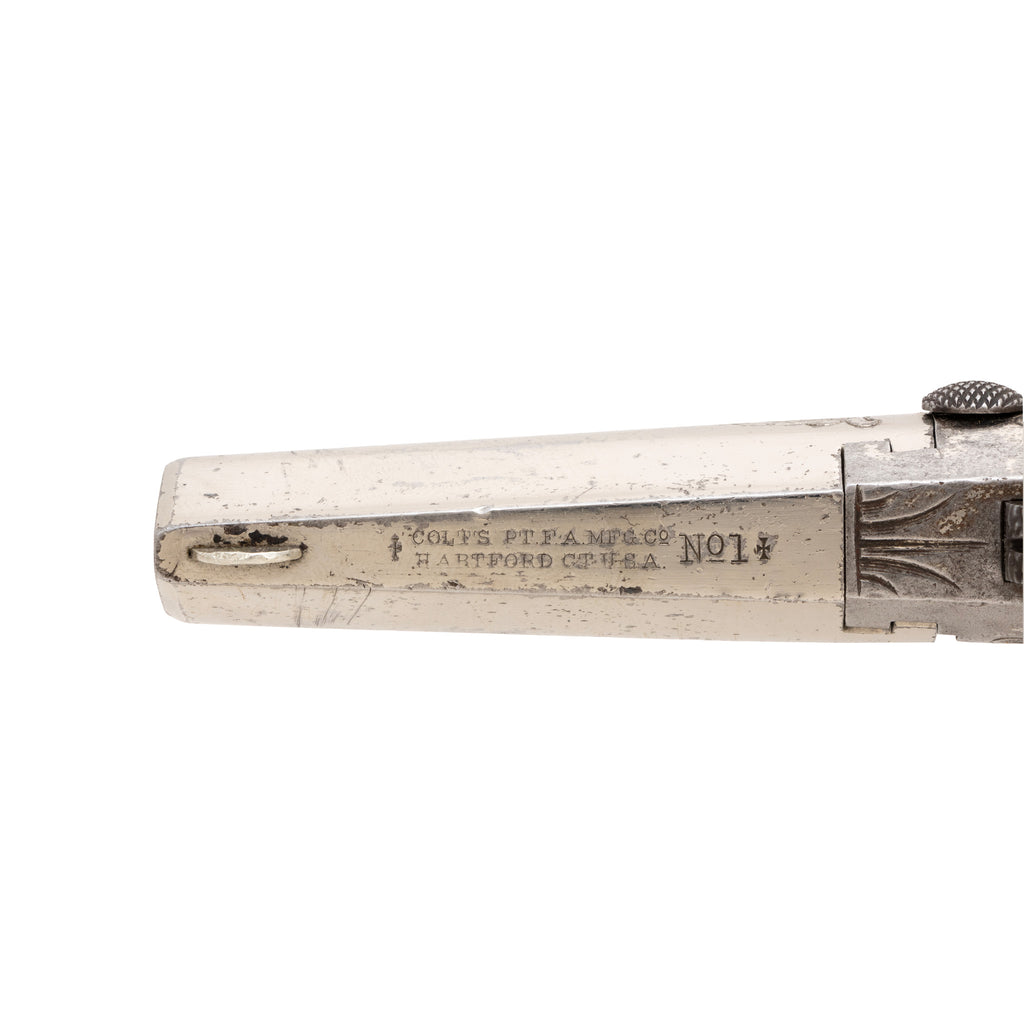 Colt first model .41 Derringer with British proofs. 2.5 inch irregular barrel, .41 RF, German silver half-moon front and hammer notch rear sights. Standard two-line Hartford address and "NO1" marking flanked by Maltese crosses and British proofs on the underside. Matching serial number (825) on frame and barrel. Broad scroll engraved iron frame, with shallow checkering on the sides and deep, sharp checkering on the back. Cisco’s has additional firearms in the Gallery post 1896. Call for itemized catalog.