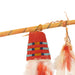 Crow coup stick that belonged to Chief Plenty Coup, Battle of the Rosebud. Collected directly on the reservation. Painted and red stroud wrapped shaft with feather drops (original feathers replaced with hand painted turkey feathers). Drops of ermine, feather, red and blue stroud.