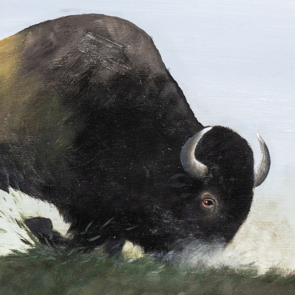 Oil on board; 24" x 36". Framed. A Nez Perce artist. Mario Rabago - Self taught, he lived on the Nez Perce Reservation at Lapawai, Idaho most of his life. He learned the stories of the Nez Perce direct from the "old men" at the sweat house, "the Nez Perce are my best friends. . .The only thing I paint are Indians and historical events always related to the US Army and the Indians which I know very well and try to be accurate. If I had to choose somebody who influenced me, I'd have to say Ace Powell. Although I use acrylics for my backgrounds which are simple because I like to go directly to the subject…"