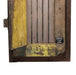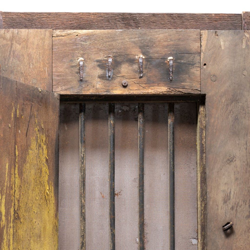 Deadwood, Kansas prison window. Wood and iron having metal wire screen with a back door that pulls out to show iron bars, plaque reading "Deadwood, Kansas Dakota Territory, Circa 1879 jail window 1 of three removed after the town burned."