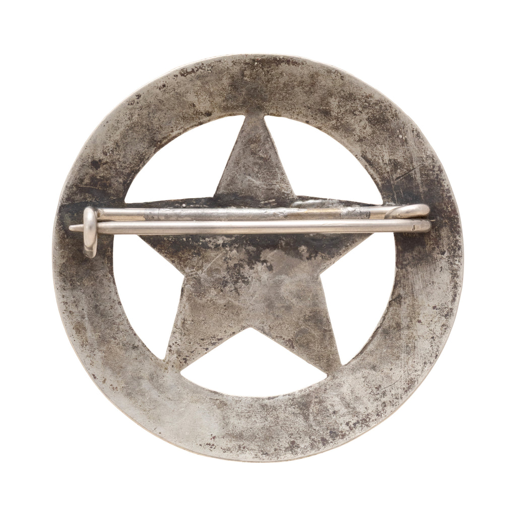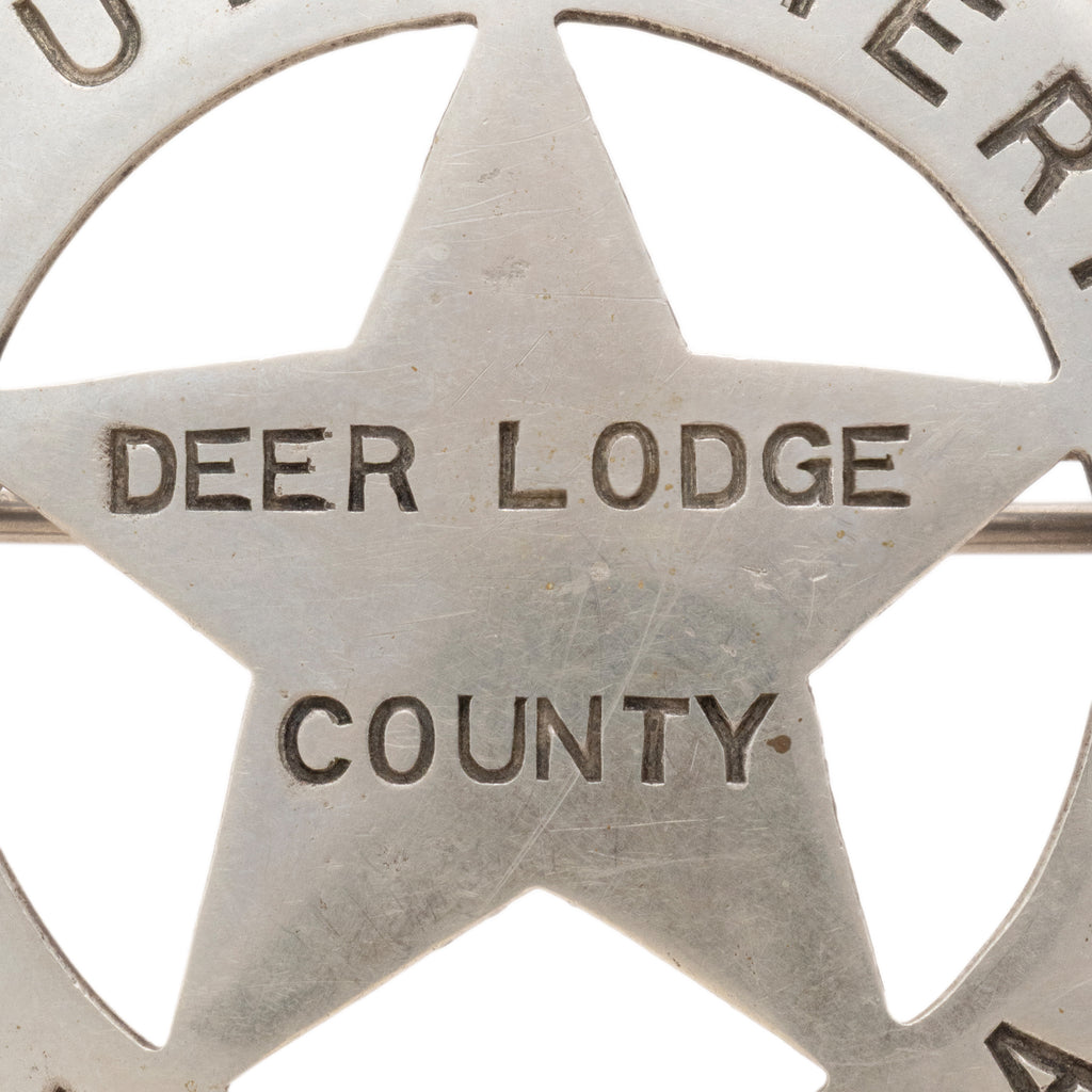 Vintage Circle Star Badge, 5-point cut out star, marked "Deputy Sheriff/Deer Lodge County/Montana". The county was established in 1865. Nice patina front and back, measures 2 1/4" D and has a heavy saddle pin and catch. Ex. Hutcheson Collection.