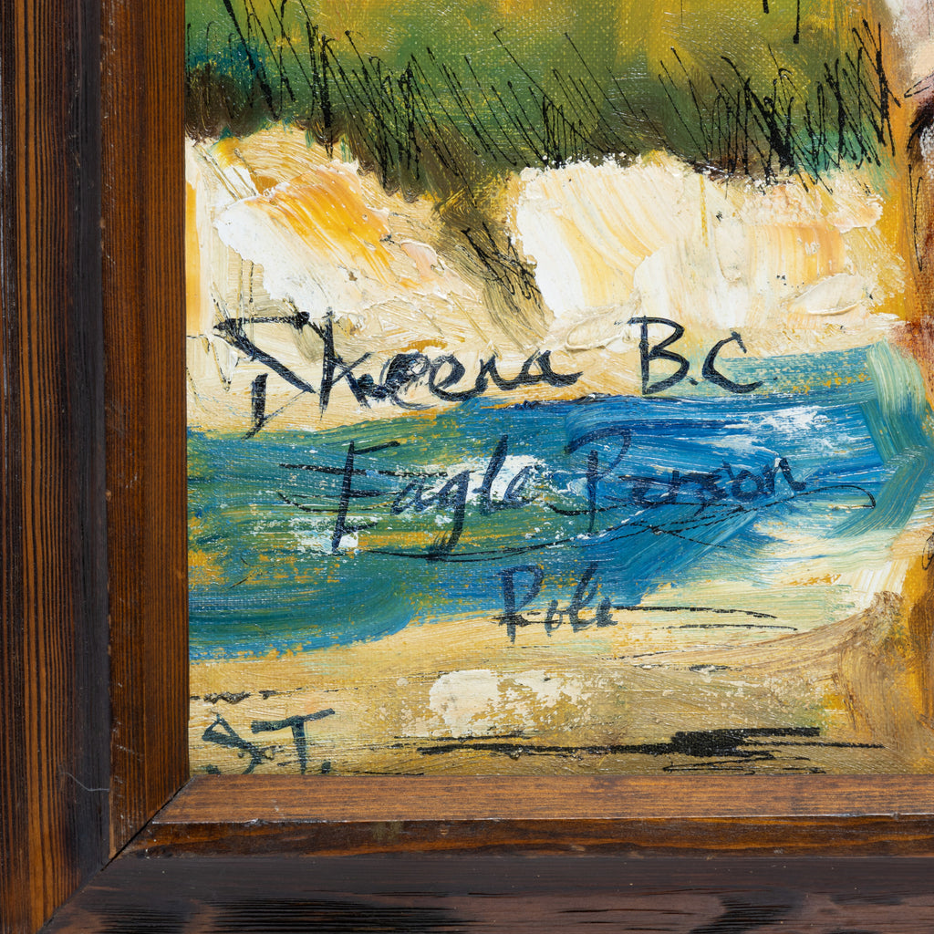 Totem pole painting from Skeena, BC; signed "S.T. ". Oil on board; 16" x 20"; original frame.