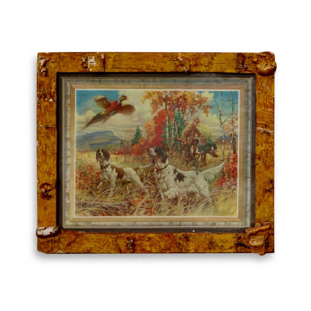 Early calendar top litho, unsigned. Superb birchbark frame. Came from a Minnesota lodge. 11" x 14".