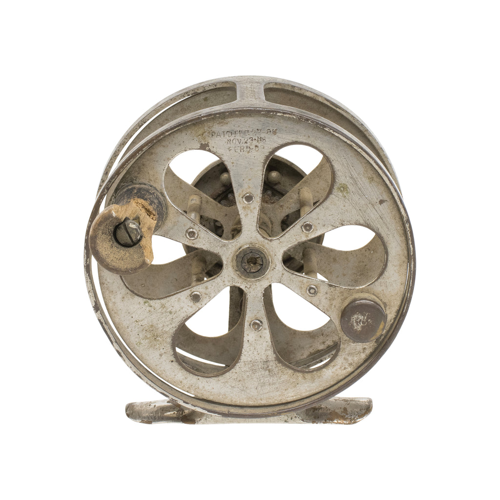 Early fly reel. Multiple patent dates. Last 1896. Wooden handle partly broken. Umarked. 3"D Zinc over brass.