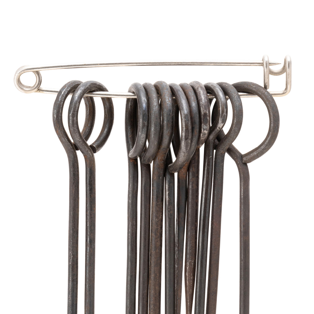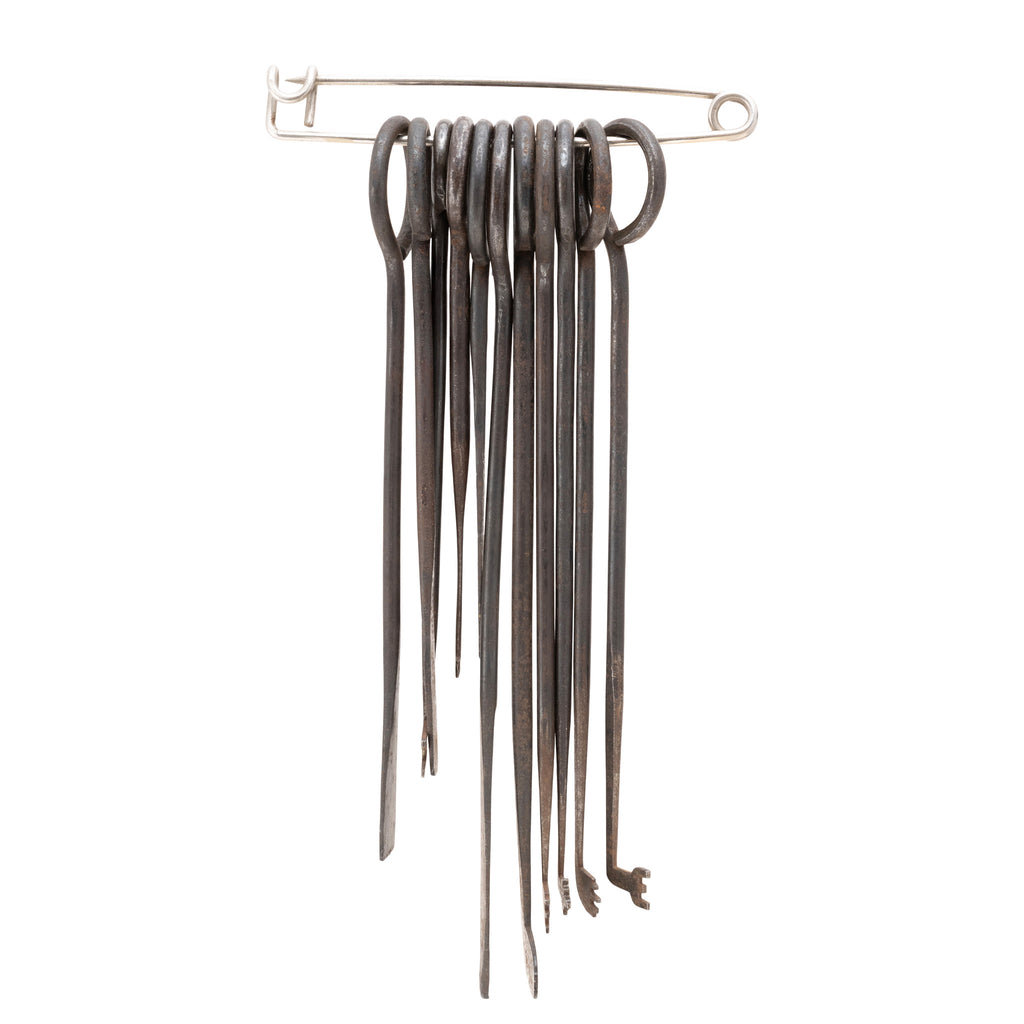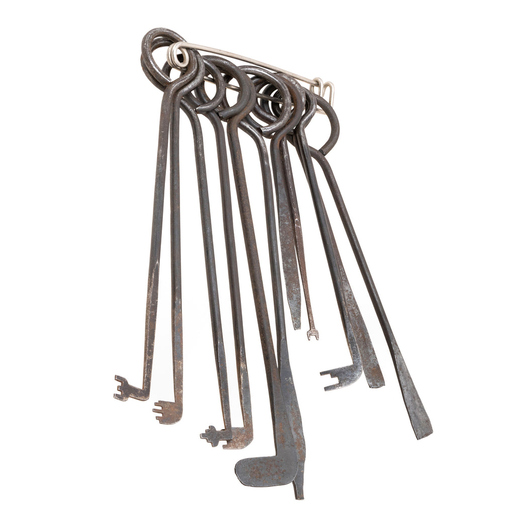 Early forged iron lock picking tools. Eleven hand forged tools together on a large pin. 4 3/4"L to 7 1/2"L. 19th Century.