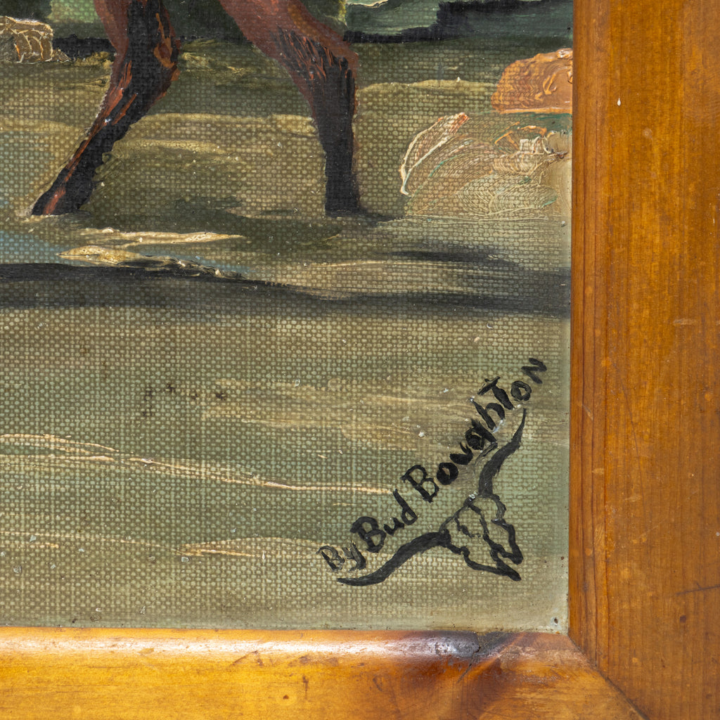 Elk family; oil on canvas/board by Bud Boughton. A local Coeur d'Alene, Idaho artist. 16" x 20" framed 22" x 18 1/2". Edges on Folk Art. Painted on Coka Cola masonite sign.