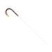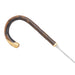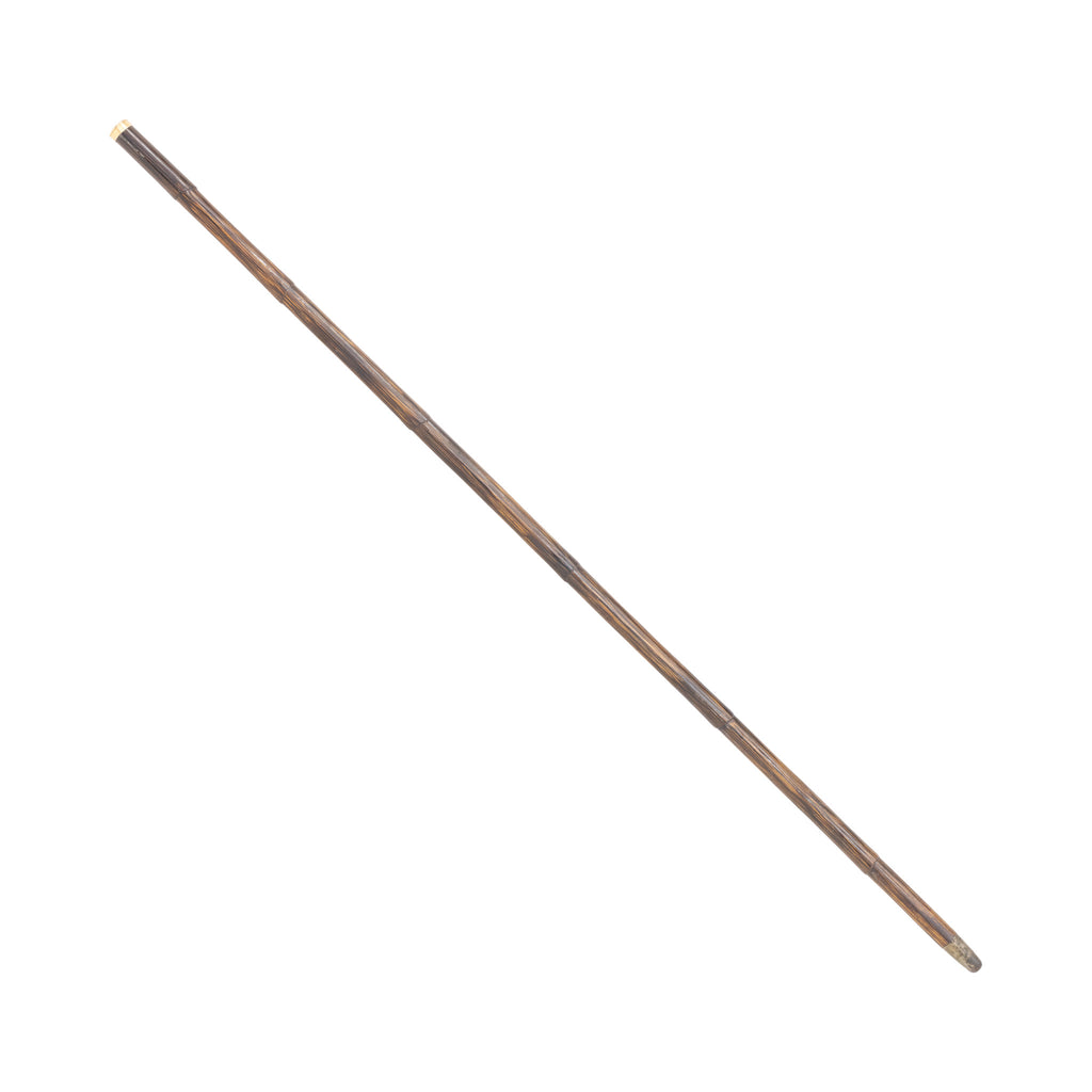 Ca. 1880 The cane is fashioned of a single piece of laurel with a formal crook handle. The slender clum shows well-defined, regularly alternating nodes and progressively elongated segments, distinguished by a hardly noticeable taper and evident and richly hued veins throughout. It is heeled by a metal ferrule. The handle detaches via a concealed, precisely geared, and fully functional quarter-turn lock mechanism, revealing a 19-inch tall, forged, and polished angular blade. It showcases two blood grooves on the broader sides for weight reduction and enhanced stiffness, to end in a beautifully stretching, long, and sleek tip. Furthermore, the blade features a broader panel with the signature “TOLEDO” positioned between its scroll ornate ends. The cane features an inconspicuous profile, making it the perfect disguised defensive weapon. It survived in its original superb condition. A long gilt metal end cap, with beautifully engraved initials, along with a pair of matching plain collars that conceal the breaking line, adds an elegant, personalizing, classy touch. The passage of time has imparted to it the indefinable and cherished character of great collectibles. Notably, sword canes rarely come in this slender quality and were a popular fashion accessory for wealthy and upper-class men, who were routinely trained in swordsmanship and wished to carry a weapon for self-defense. Despite decades of ongoing efforts and the research by several members of the cane community, the true origin of the name “Toledo,” which occasionally appears on upscale sword cane blades, remains uncertain. However, the prevailing mindset favors a marketing label suggesting the blades were crafted in Toledo, Spain. In reality, a significant portion of these blades, as well as the canes were produced at the Manufacture Francaise D'Armes & Cycles in Saint-Étienne (Loire). As a rule, most gentlemen of the 19th century owned a wide variety of canes. That collection would, and indeed, have included at least one sword, dagger, or stiletto cane. One has to remember that during the 19th century, a man's honor was sacrosanct, and the slightest verbal infraction against that honor was considered an affront worthy of a duel to the death. The wise man was consistently prepared, and the bearer of a sword cane was even more so. 6 1/2"H x 4" overall 35 1/2"