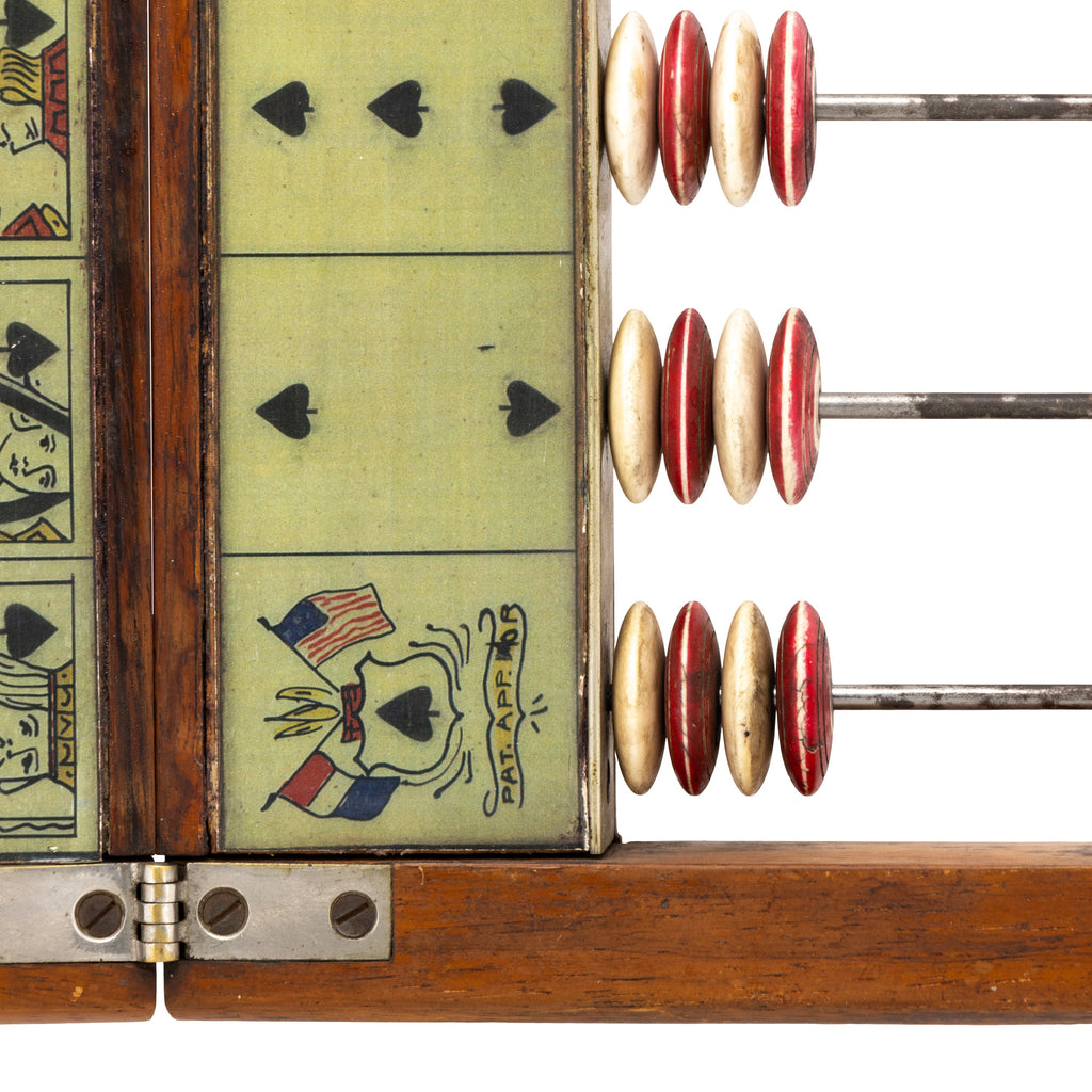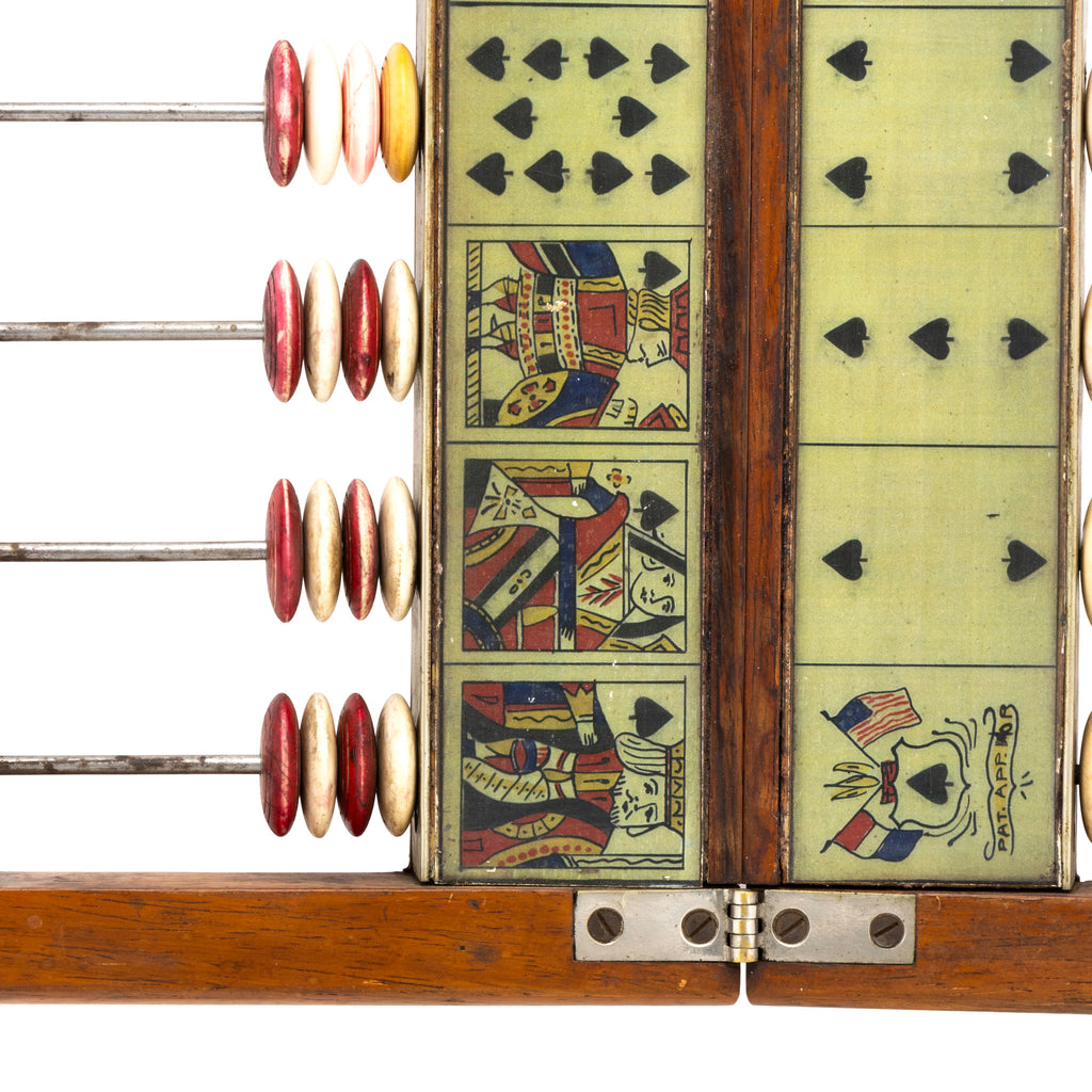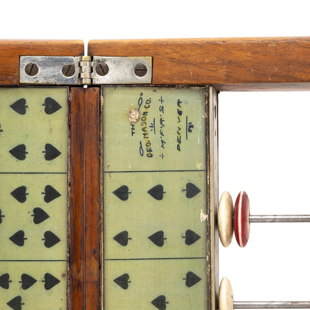 Faro case keeper with clay beads on metal poles. Suit of spades. 12" x 13"