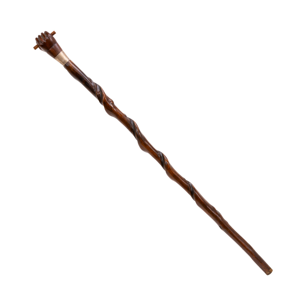 Circa 1880 fist corkscrew sword cane. Small antler handle, silver metal sealed eyelets, silver metal collar. Malacca shaft, push-pull mechanism exposed a triangular 28 1/2" sword blade and a 2 1/4" copper ferrule. 1 1/8" x 1 3/4", Blade 28 1/2", overall 34 7/8"L