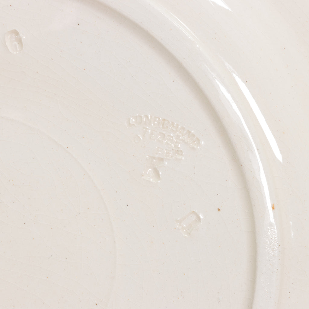 Eight French majolica asparagus plates. A rare find. Each majolica plate showcases asparagus with light green hued spears with lavender heads and surrounded by light green border. Great for spring dishes, or to adorn table settings. Signed "Longchamp," "Terre" and "KA" and stamped "1316". Priced as set.