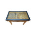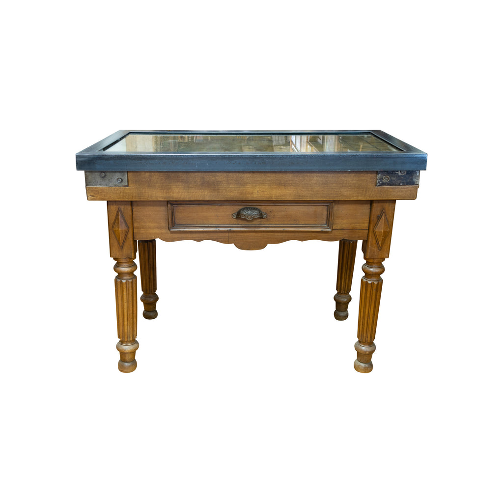 Well patinated French provincial butcher block with reinforced metal corners, drawer and fluted legs. We added burnish iron frame with glass to make functional.