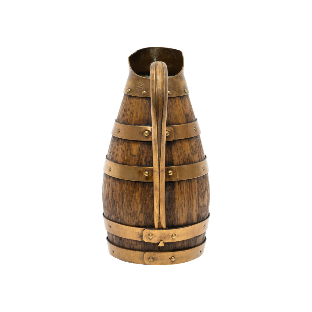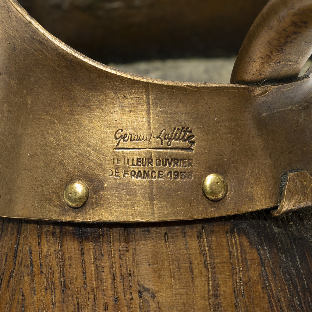 Miniature French oak and brass banded wine pitcher. Signed "Gerauld Lafitte Meilleur Ouvrier Day France 1933." 6" x 5"