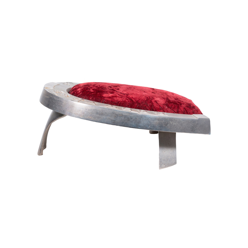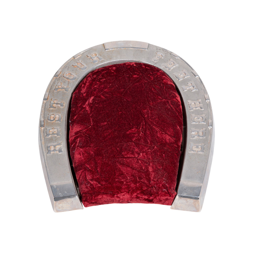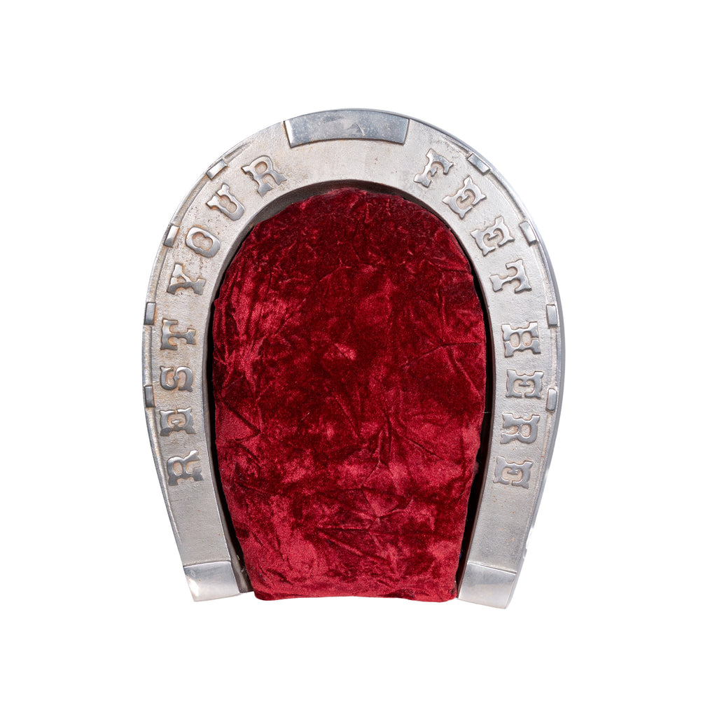 Vintage metal footrest marked "Rest Your Feet Here". Used in a western "gentleman's club."