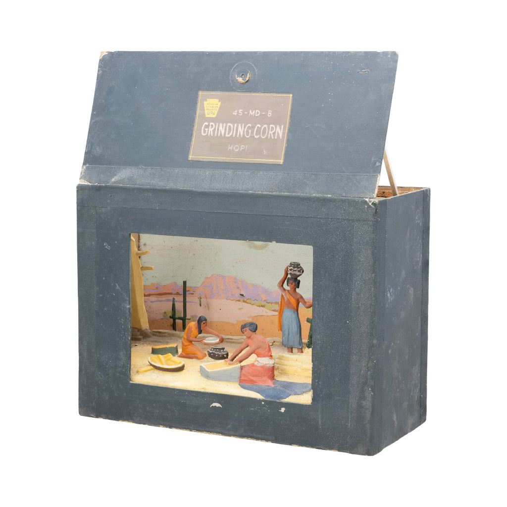 "Grinding Corn Hopi" vignette. WPA Philla (Philadelphia) Unit Statewide Museum Extension Project. Scene of two women grinding corn on monos and one carrying grinding jar on head. 15 1/2" x 6 1/2" x 11 11/2"