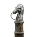 Horse head hitching post with remnants of original white paint. Original base that bolts down. From the Gold Rush days. Came from San Francisco. More decorative than most. 42" x 8 1/2"D