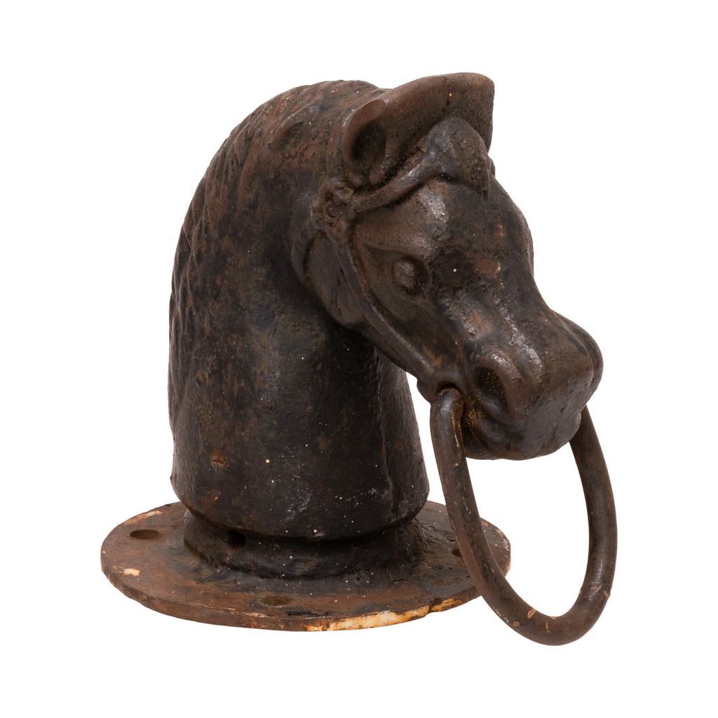 Cast iron horse head hitching post with screwed on base for post mount. 7"T x 5 3/18"D at base.
