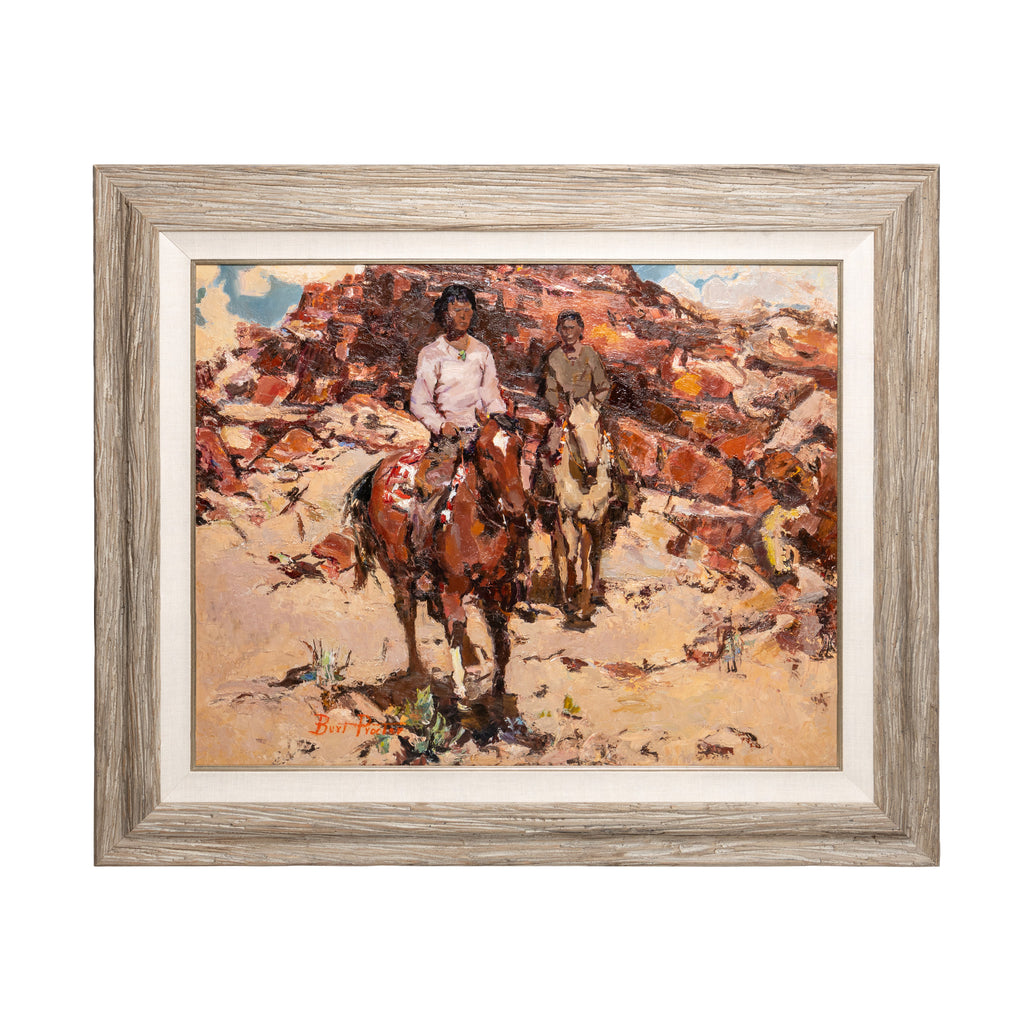 (1901 - 1980) Oil on masonite; 24" x 30", frame 38" x 33". Signed lower left. Framed. Burt Procter became a painter of western scenes. In 1908, at age seven, he moved with his family to Oak Park, Illinois. He took art classes at the Chicago Art Institute and later at the Chouinard and Otis Art Institutes in Los Angeles. During that time, he lived in Pasadena, working as a commercial artist, and in the late 1920s, went to New York City where he held the job of Art Director with the advertising firm of Lord, Thomas & Logan. His subjects range from marine to desert landscapes. He also painted scenes from his travels to Asia and South America. In 1973, the First Annual National Academy of Western Art exhibition included one of his paintings.