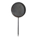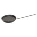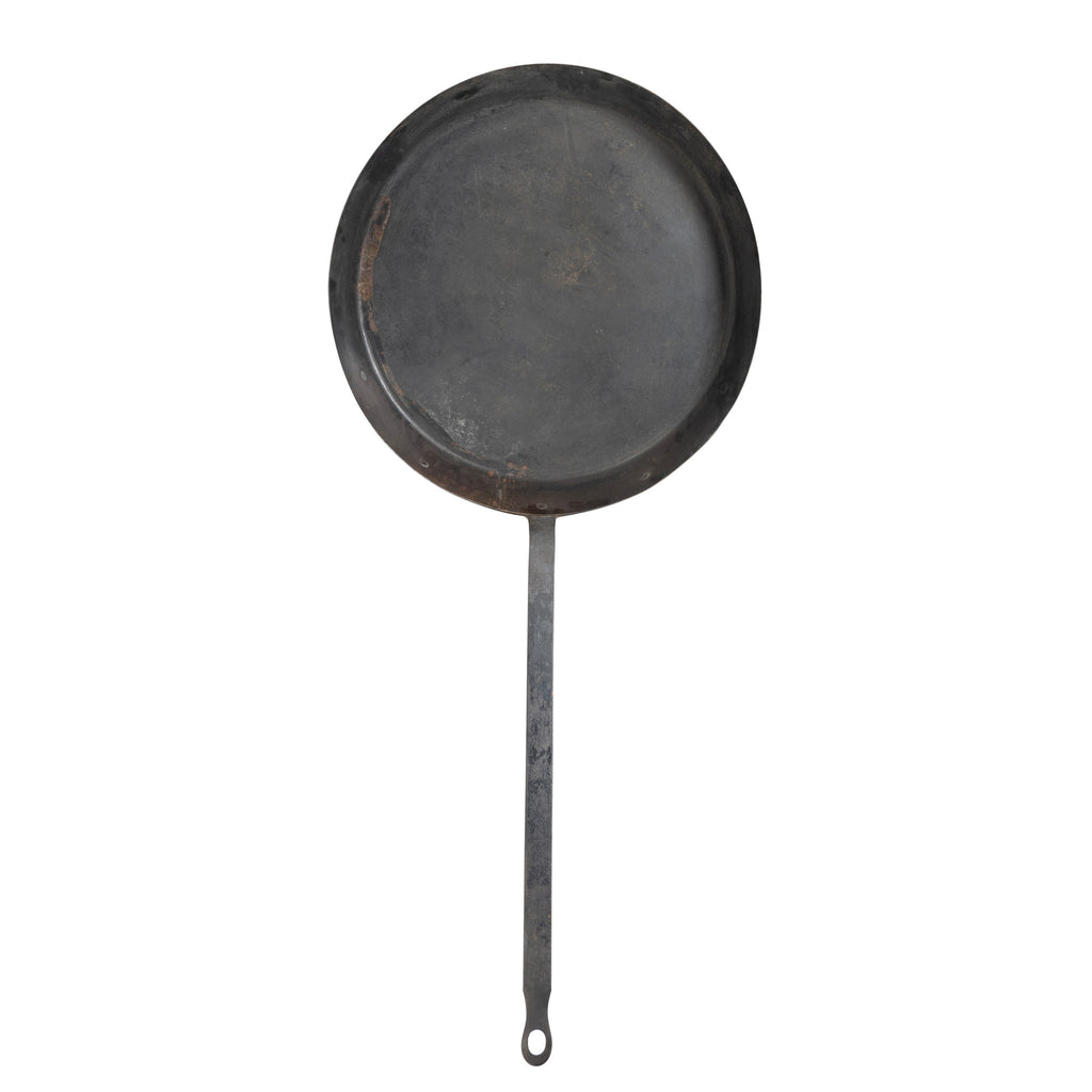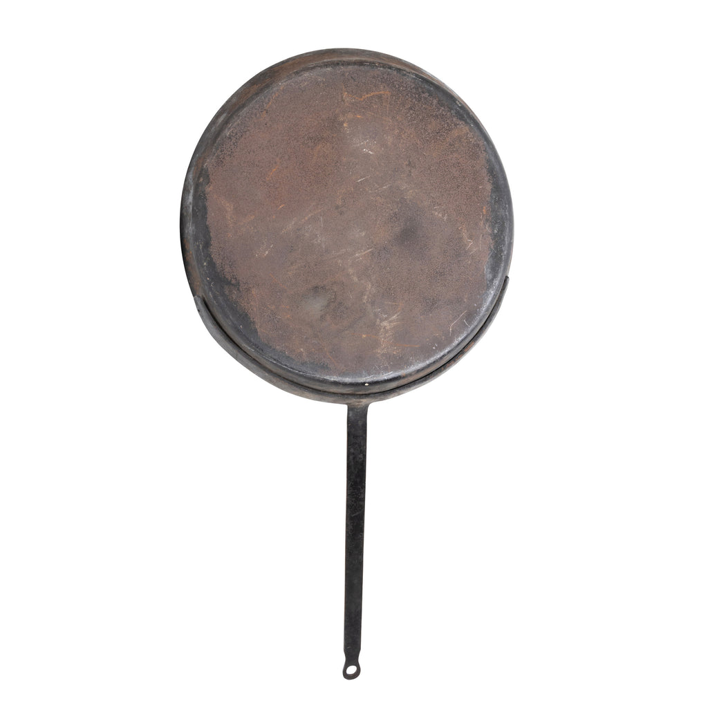 Fry pan that was carried on a pack train. Blacksmith made lighter weight riveted handle. Long handle for wood fire. 22"D, handle 44"L