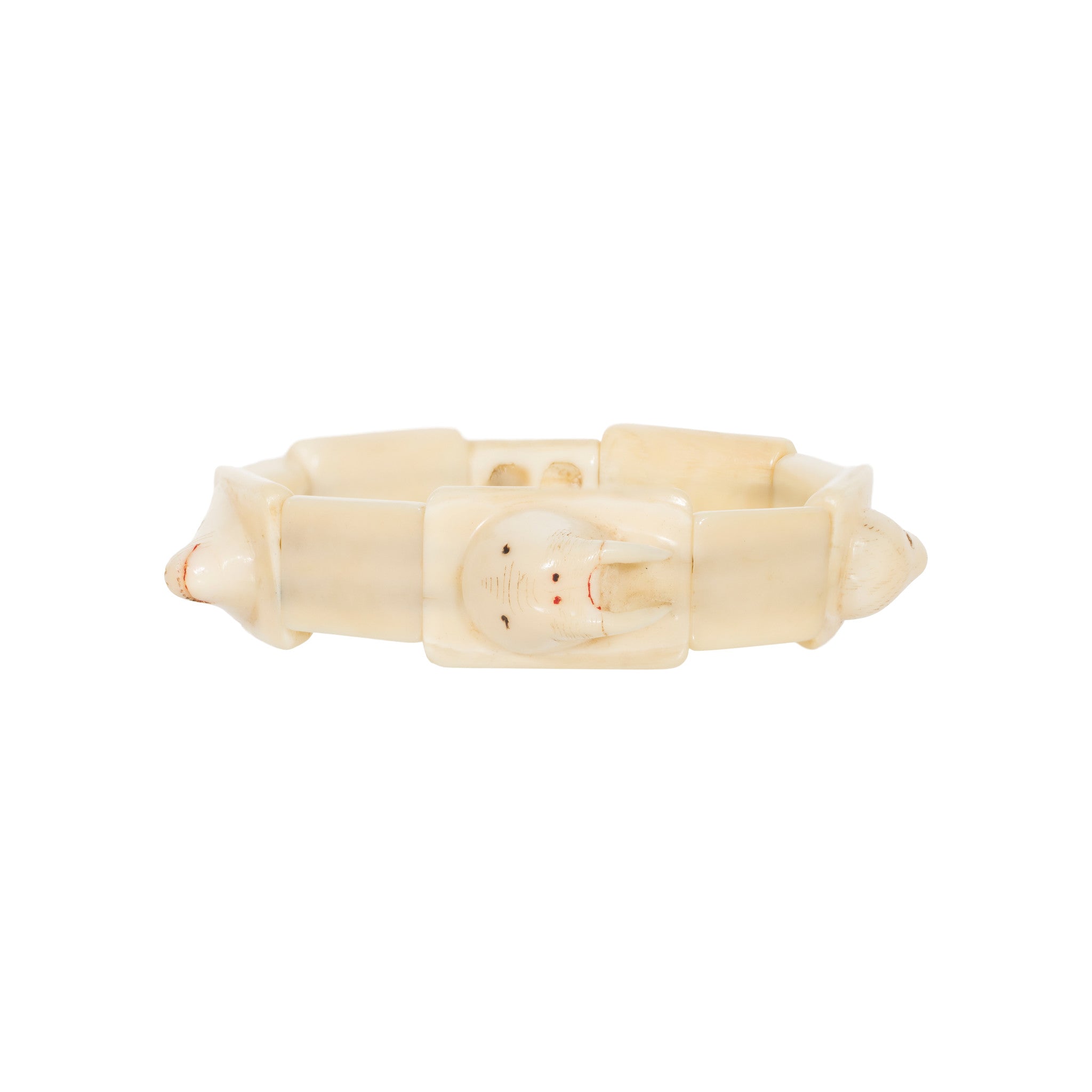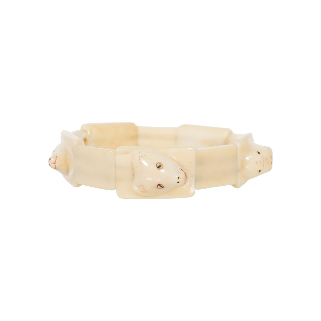 Inuit carved walrus ivory bracelet with plaques having animal heads in relief attached by elastic. 5" expandable