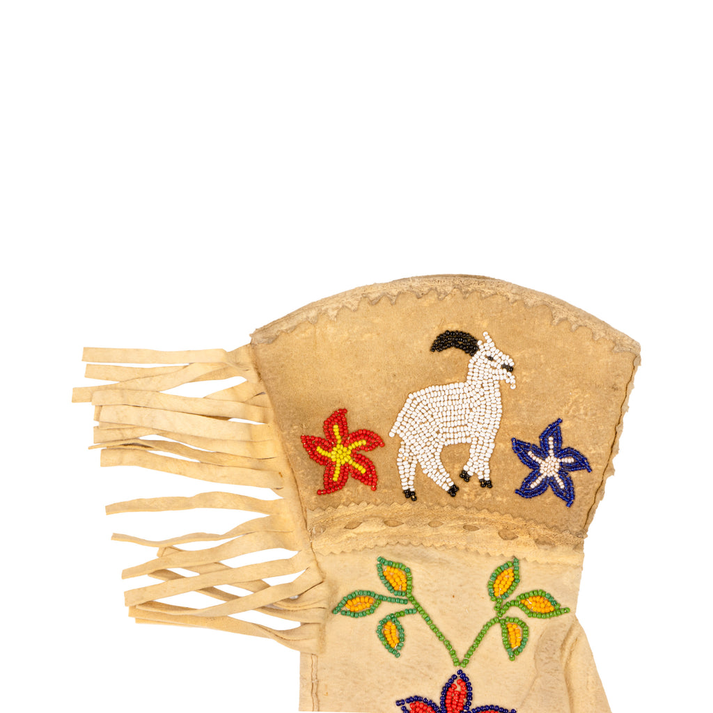 Pair Kalispell beaded gauntlets with floral and mountain goat motif. The United States Cavalry riders wore gauntlet gloves as part of their uniform, introducing the clothing style to plains tribes who turned the gloves into spectacular works of art with painstaking beadwork. As skilled horsemen, Sioux and other plains tribes took great pride in their horses and often wore symbols that celebrated their warrior and rider status, such as these gauntlets. Western cowboys and rodeo performers adopted the beaded gauntlets made by Native People into their fancy wear.