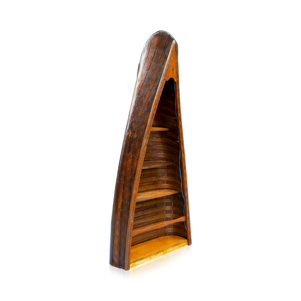 Lighted canoe shelf from a 19th Century canoe with three shelves plus bottom. Once had a skin, now removed and shellacked. 6’4”x 36’W x 15”deep.