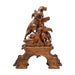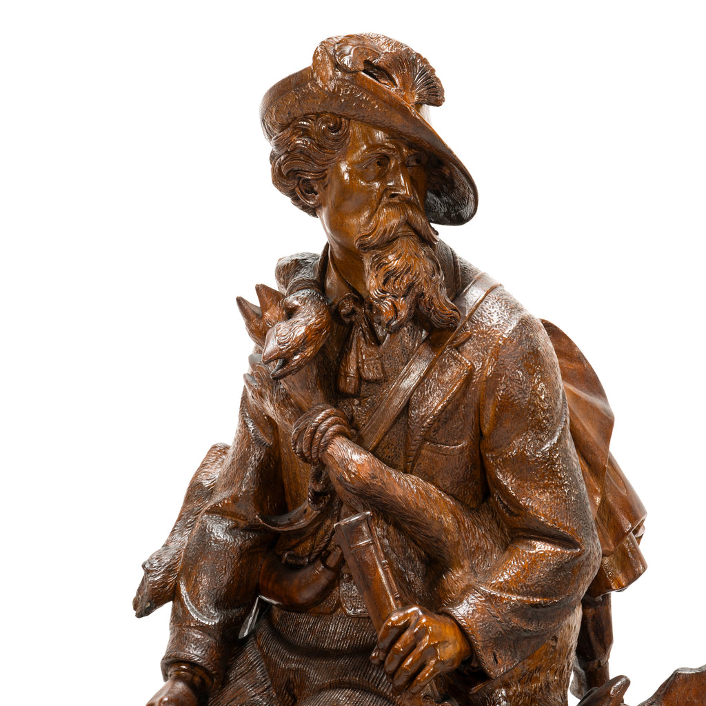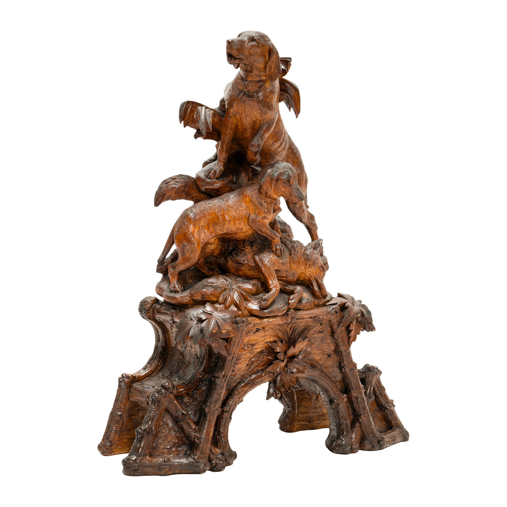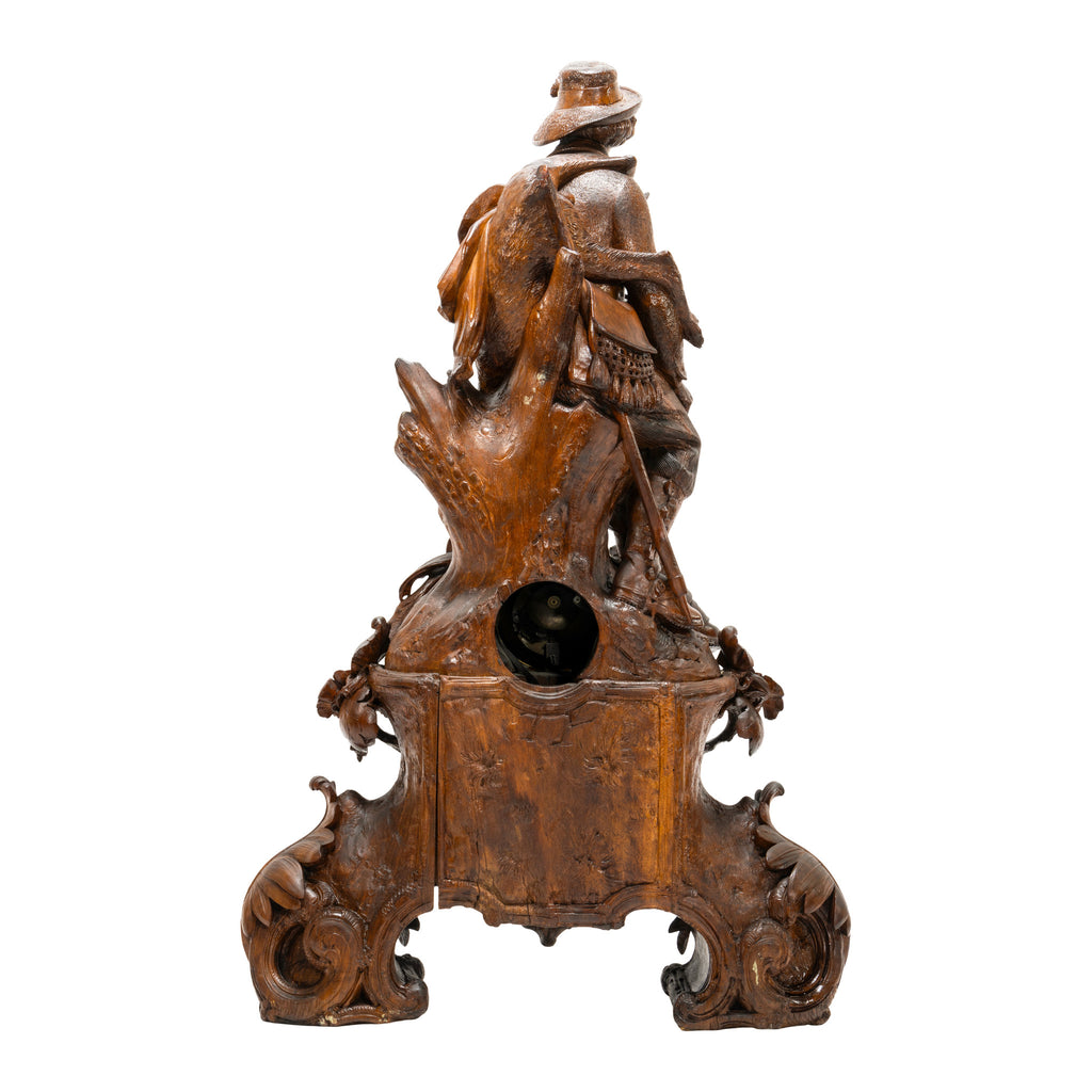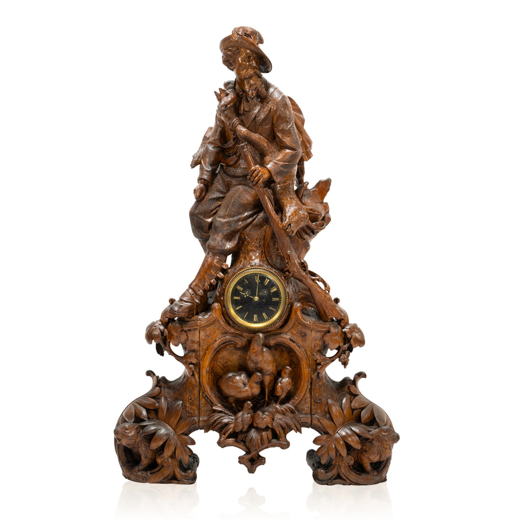 Magnificient hunter and hounds Black Forest carved mantle clock set. The center piece under flintlock carrying a chamois over his shoulders with a slicker, pouch and mountain climbing pole hanging from his back resting on a stump. This all over a carved base with a pair of quail and three babies. Each side are two pedestals eaching having two dogs, one with a game bird in mouth and the other resting over a fox. Carved of linden wood. Clock fully restored. The best of the best! Clock 23"W x 38"H x 10"D including extended quail. Pedestals 17" x 7" x 24"H each