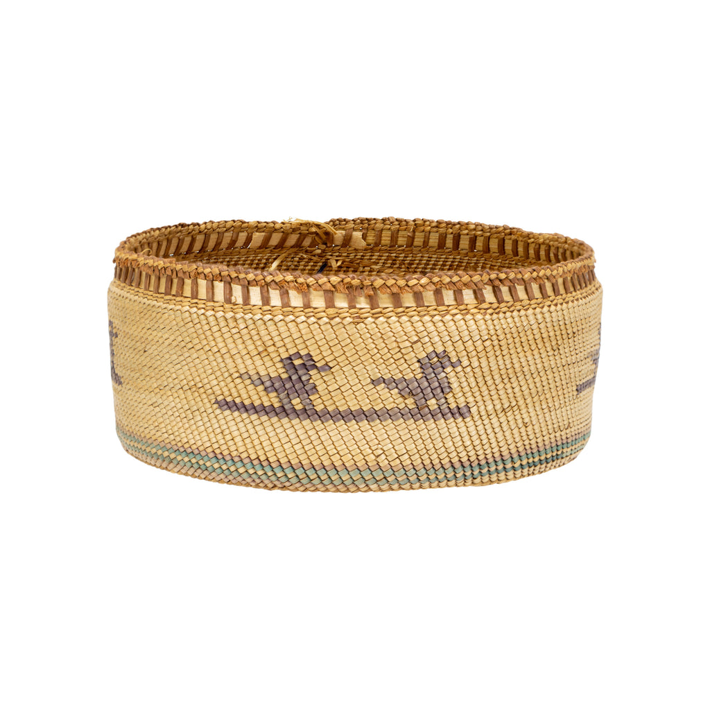 Makah lidded basket with duck figures and orange banded finial. Very tight weave.