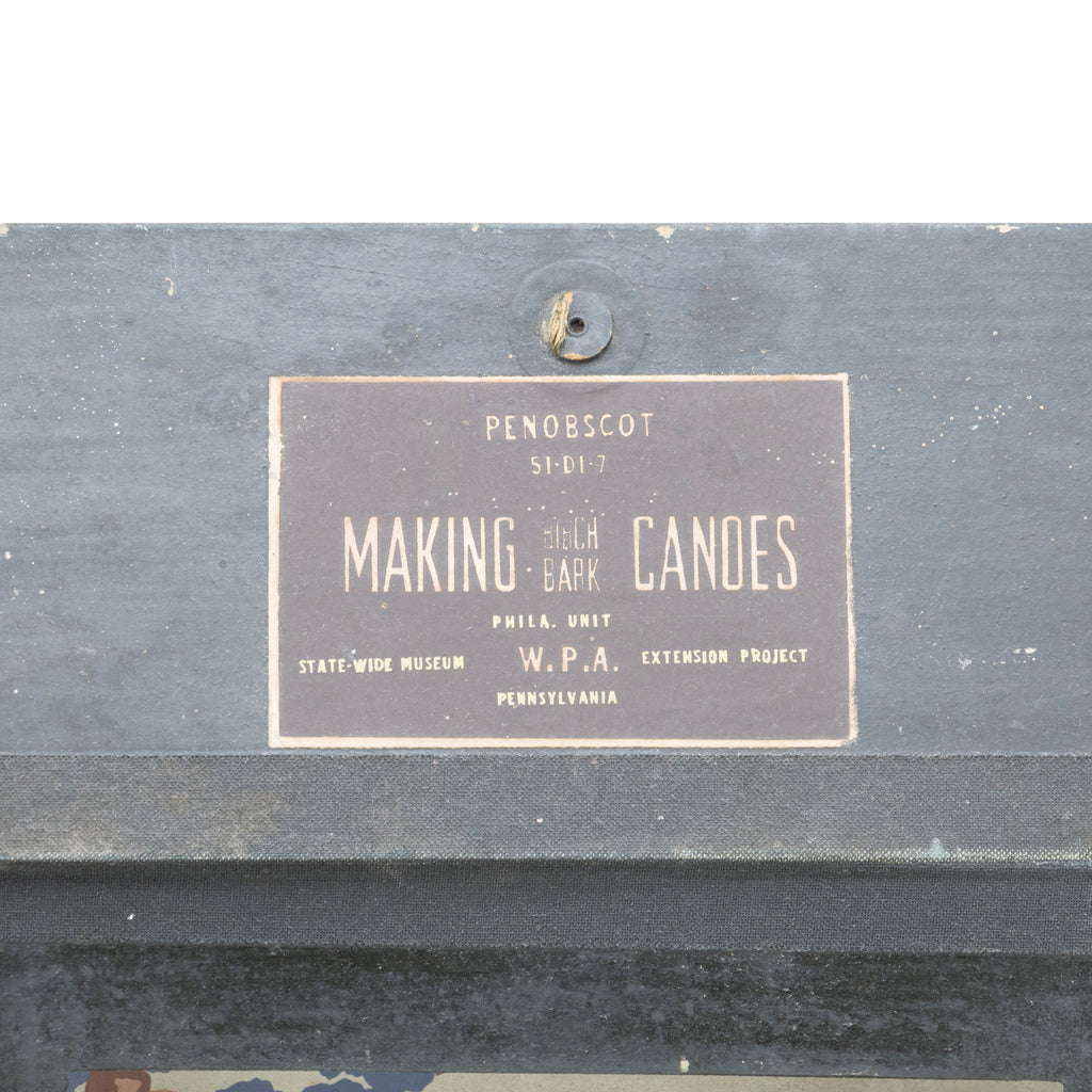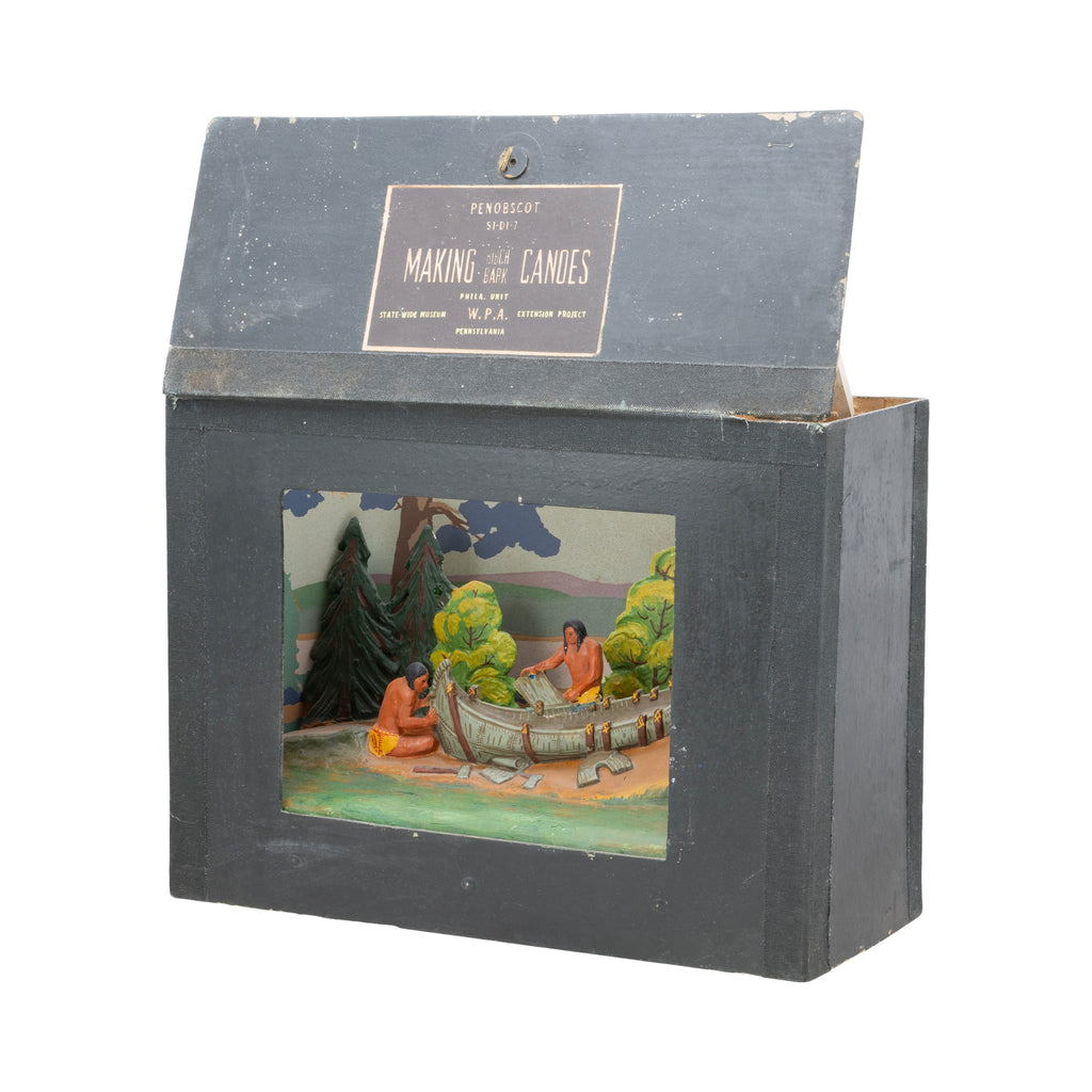 "Making Snowshoes" WPA vignette. Phila (Philadelphia) Unit Statewide Museum Extension Project. Scene of two Native Americans building birchbark canoe. 15 1/2" x 6 1/2" x 11 11/2"