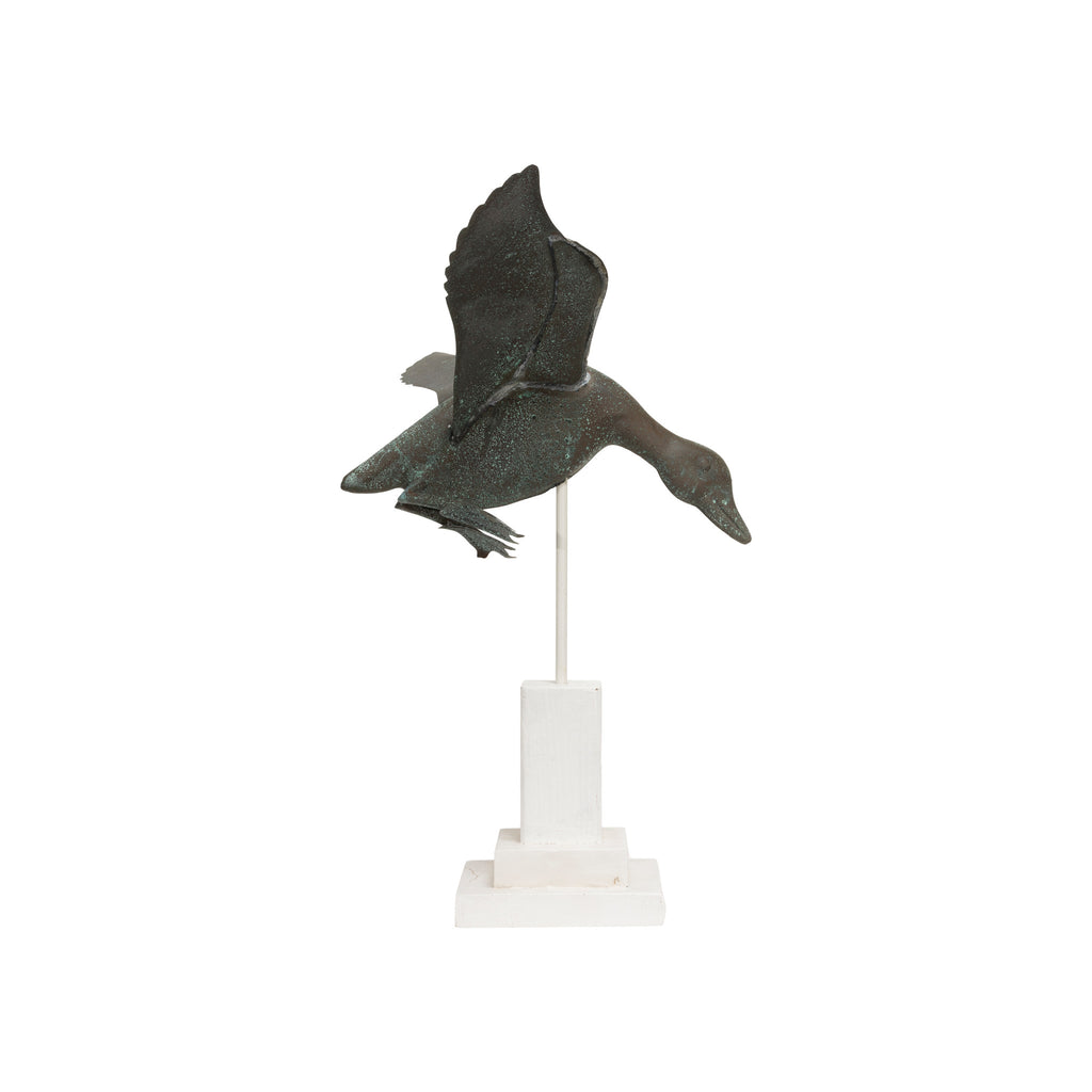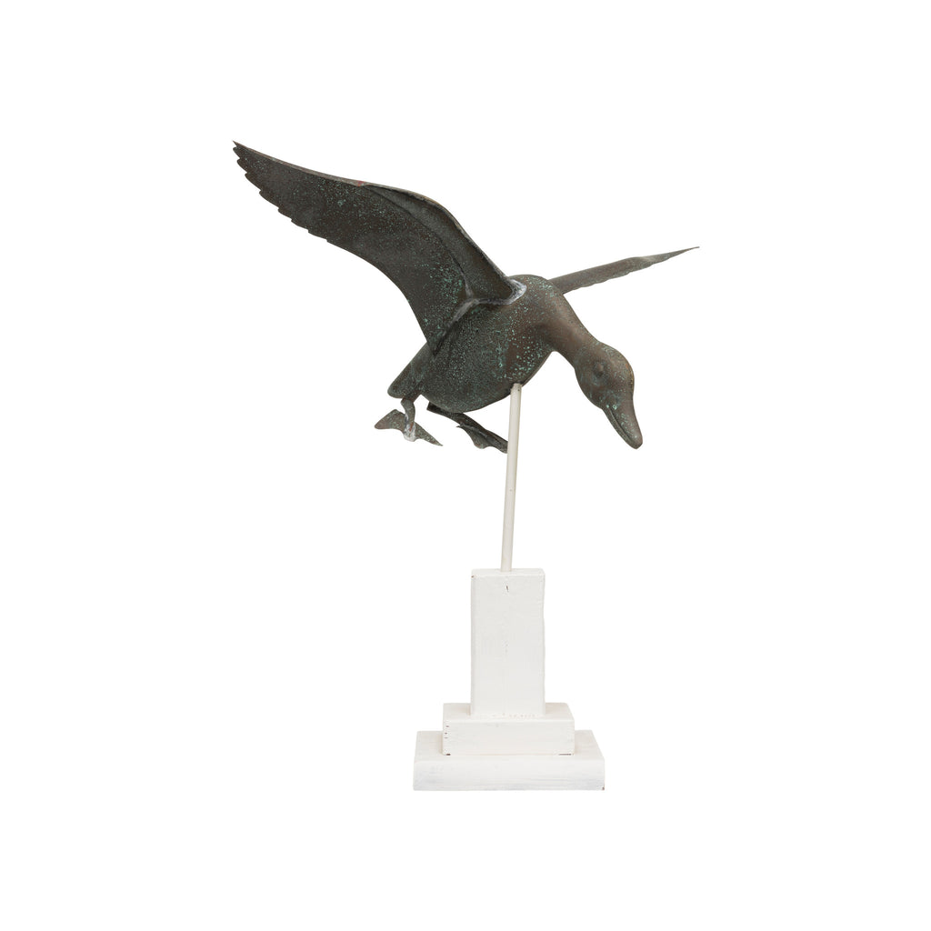 Copper mallard weather vane in verdigris patina. Diving position. Three dimensional. 28" wing span, 14"H on more modern wooden base 27" overall.