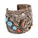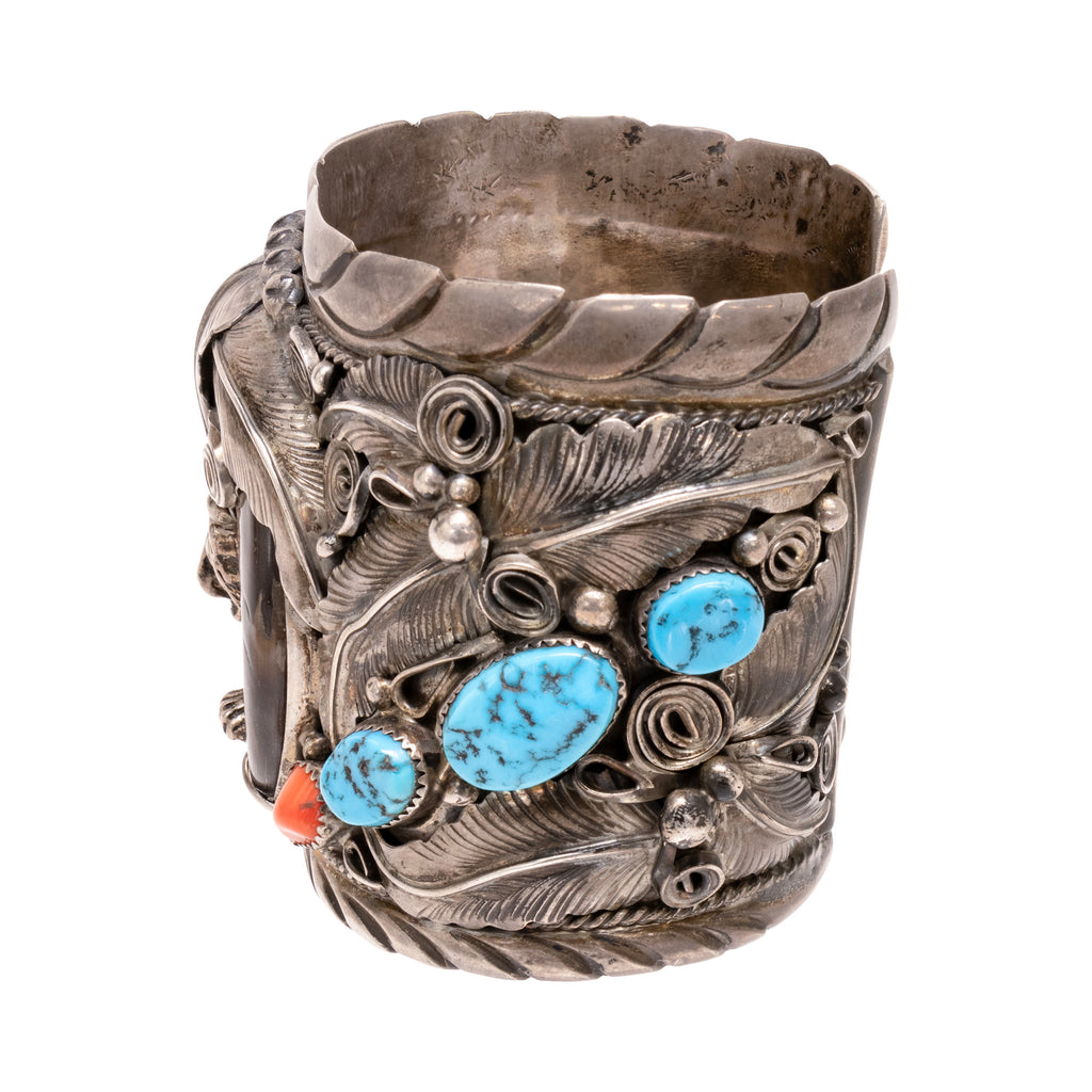 Large heavily decorated man's cuff, with black bear claws, Bisbee turquoise, and coral. Marked M. Thomas.
