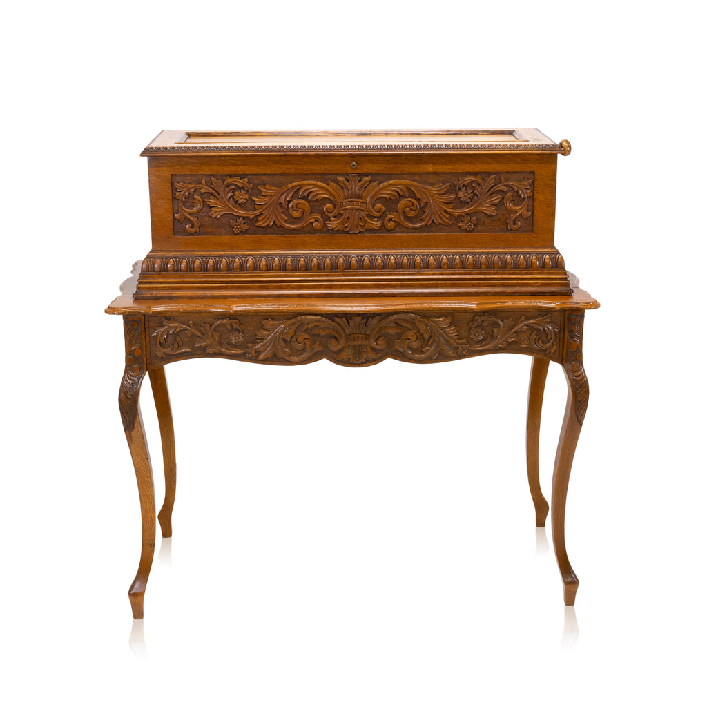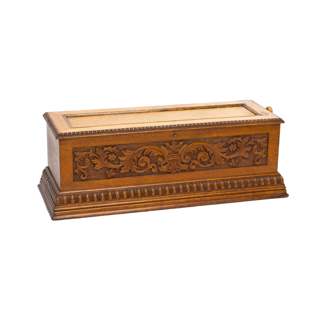 Mermod Frères Oak Cylinder Music Box on Stand, Sainte-Croix, Switzerland. circa 1895. each decorated with foliate and scrolling carvings, with a Jacot's Patent Safety Check and signed with firm's mark. Great sound with ten beautiful tunes. 43 1/2" x 43 1/2" x 22"