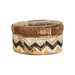 Micmac fully quilled oval box with geometric designs. Birch bark, quills and sweetgrass. (lid is loose from rim). Wood bottom.